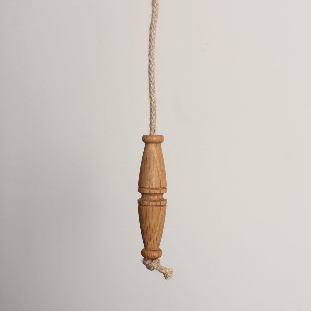 Large solid oak light pulls knotted on a 5mm thick jute rope (2 metres long).