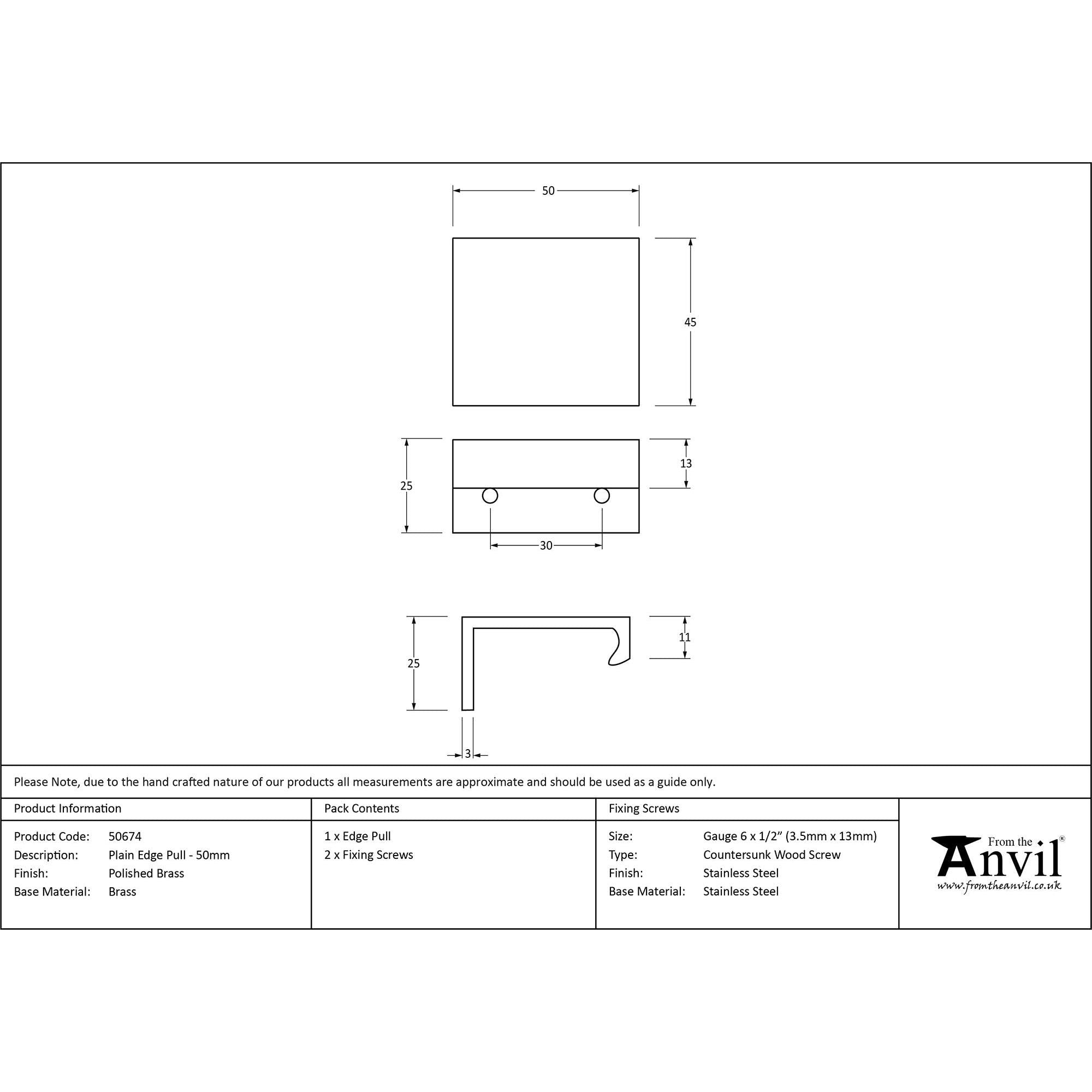 Polished Brass 50mm Plain Edge Pull | From The Anvil