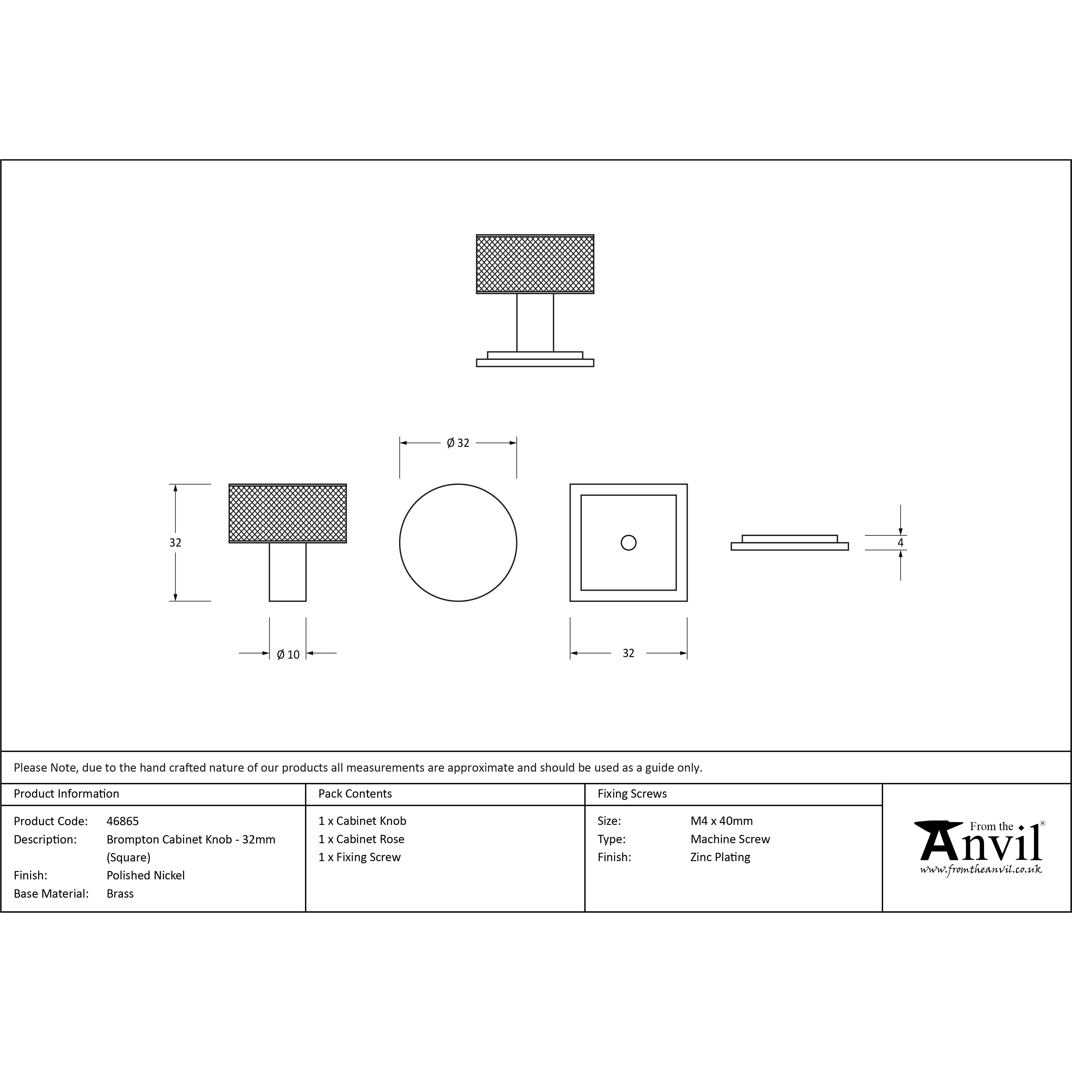 Polished Nickel Brompton Cabinet Knob - 32mm (Square) | From The Anvil