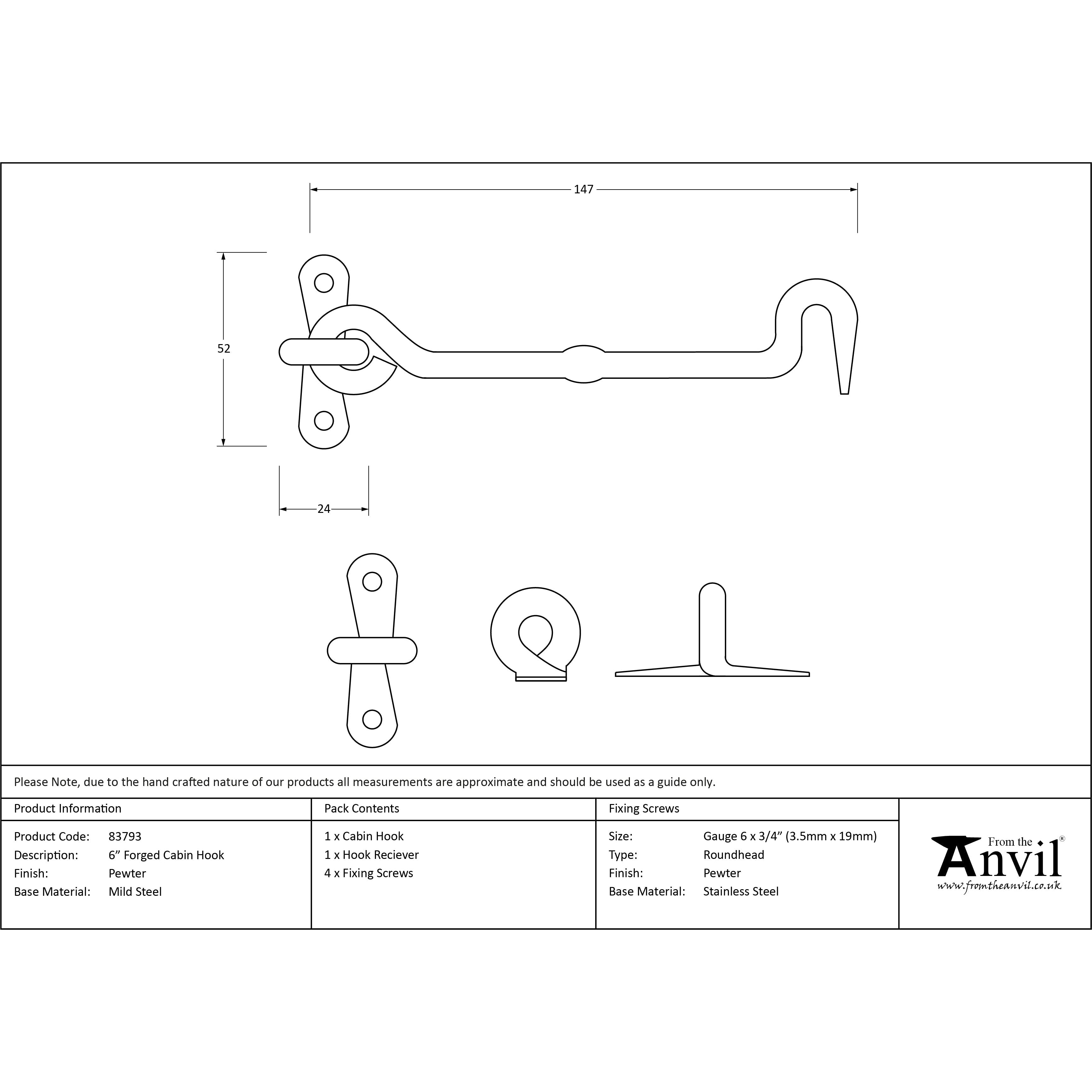 Pewter 6" Forged Cabin Hook | From The Anvil