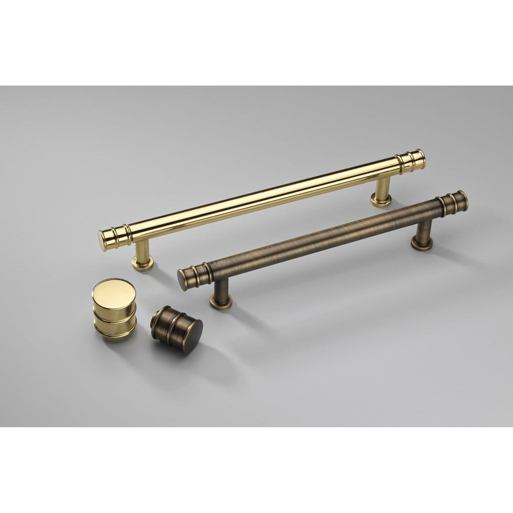 This unique design creates a knob and handle, which are both immediately recognisable and yet infinitely spellbinding. With a simple cylinder bound by strategically placed rings, this handle exudes strength and brutal industrialism with a splash of beauty.