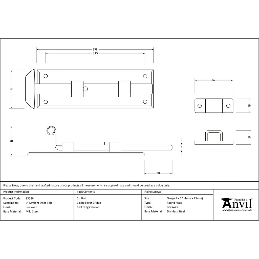 Beeswax 6" Straight Door Bolt | From The Anvil