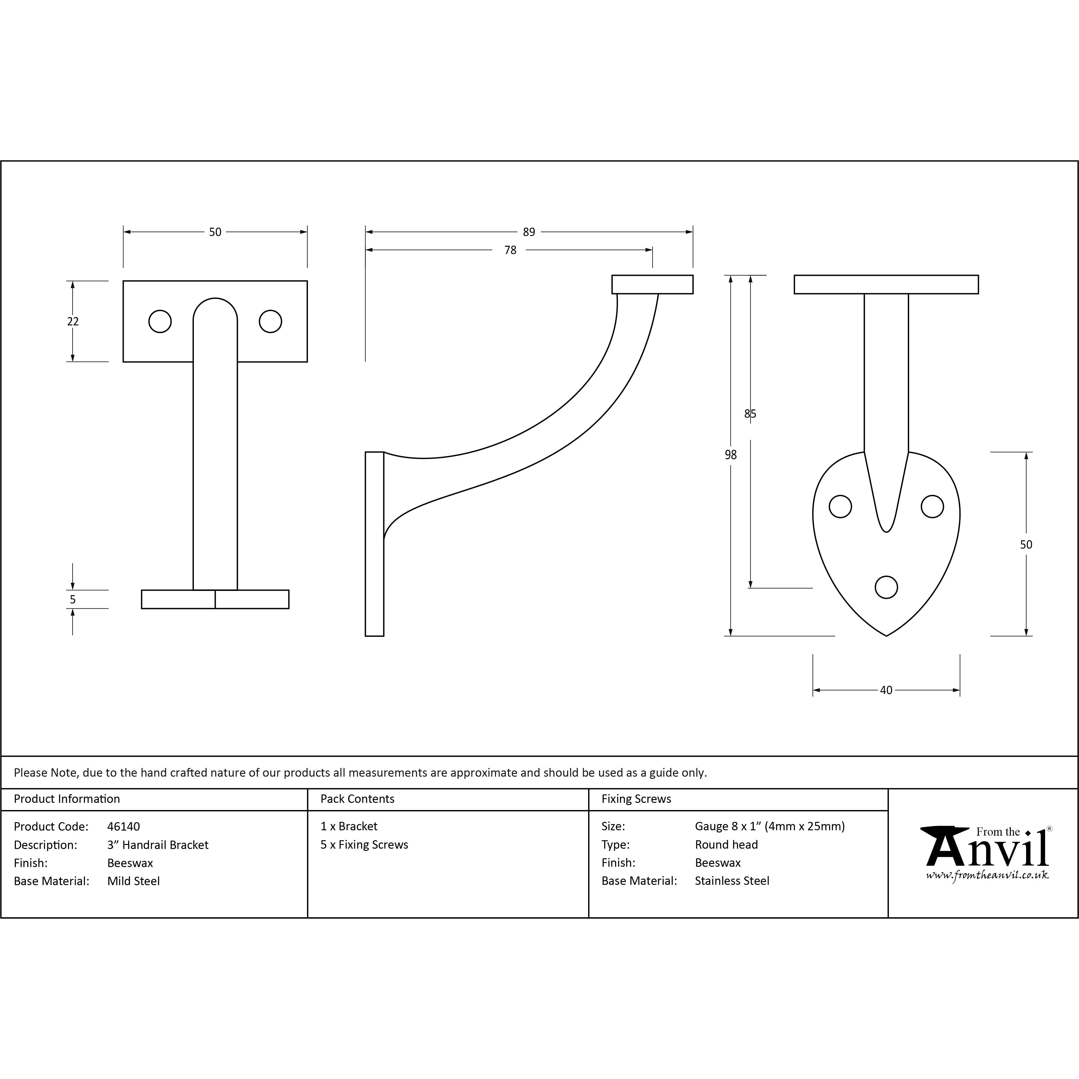 Beeswax 3" Handrail Bracket | From The Anvil