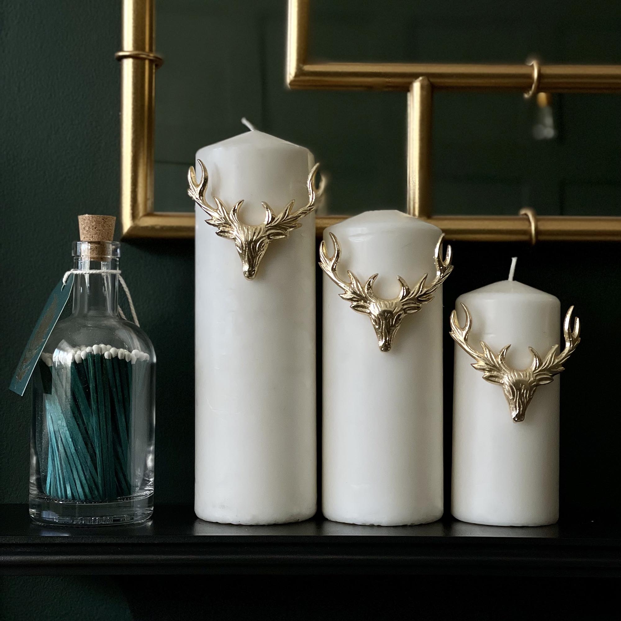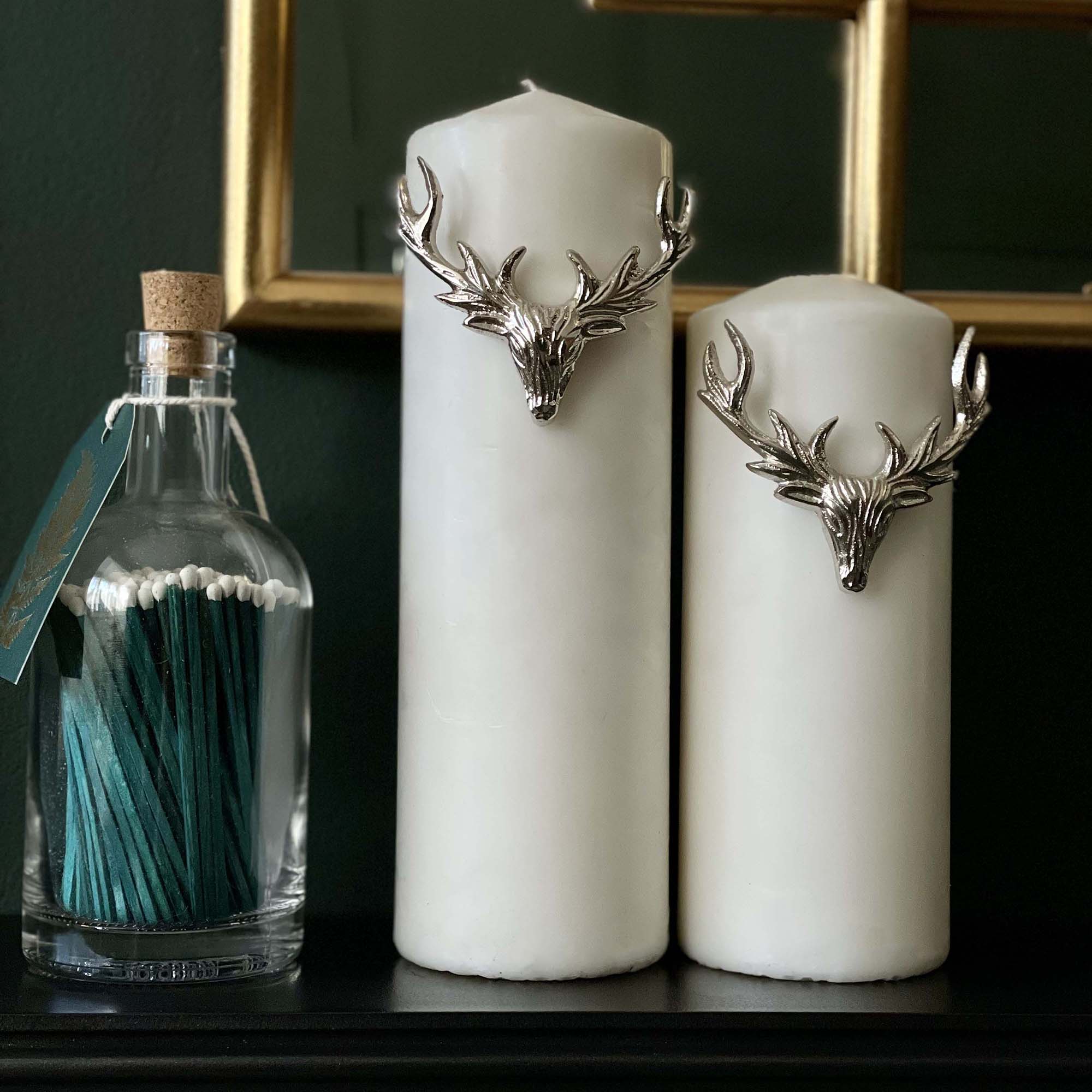 This set of three large solid metal stag candle pins will add a sense of the wilderness to your candles and home.