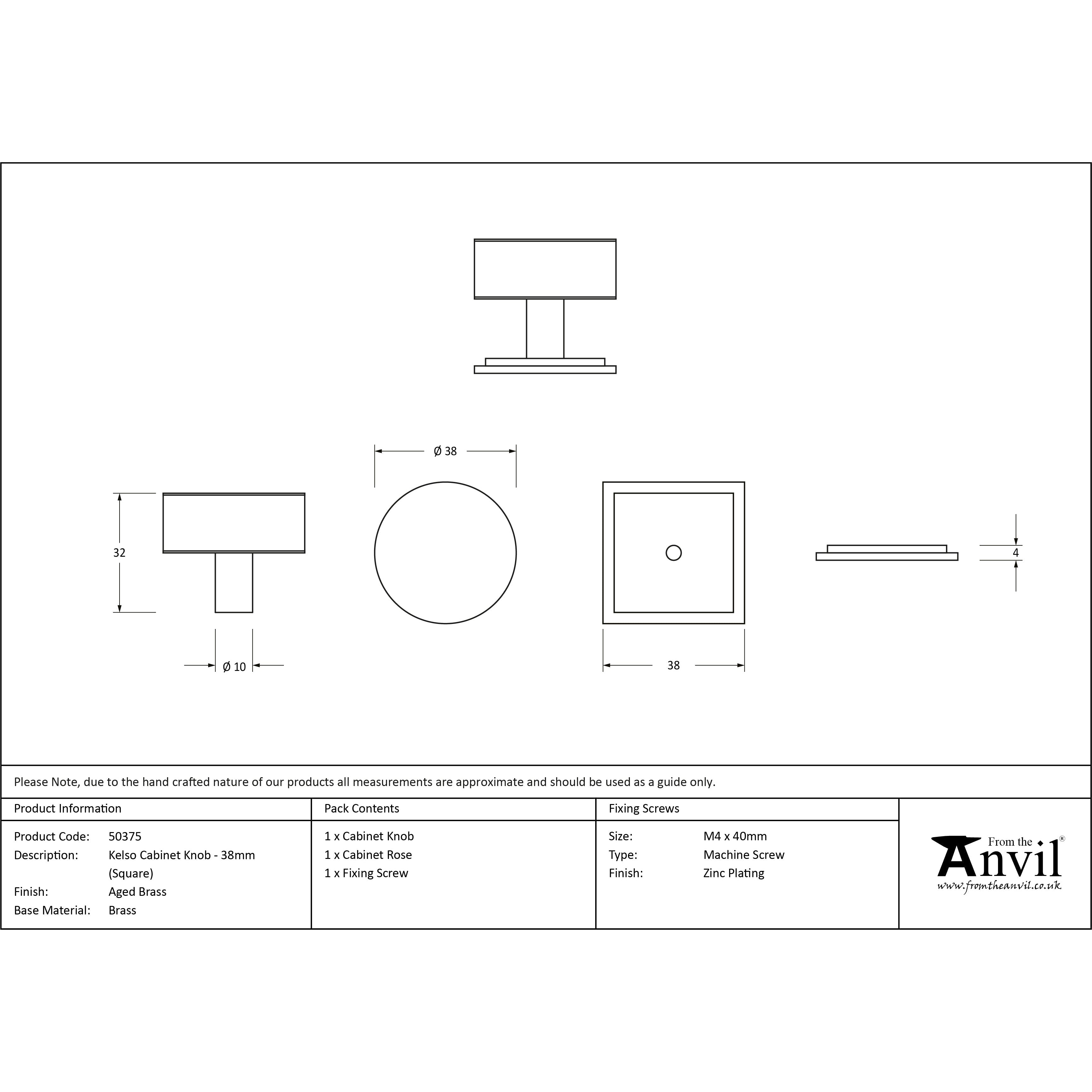 Aged Brass Kelso Cabinet Knob - 38mm (Square) | From The Anvil