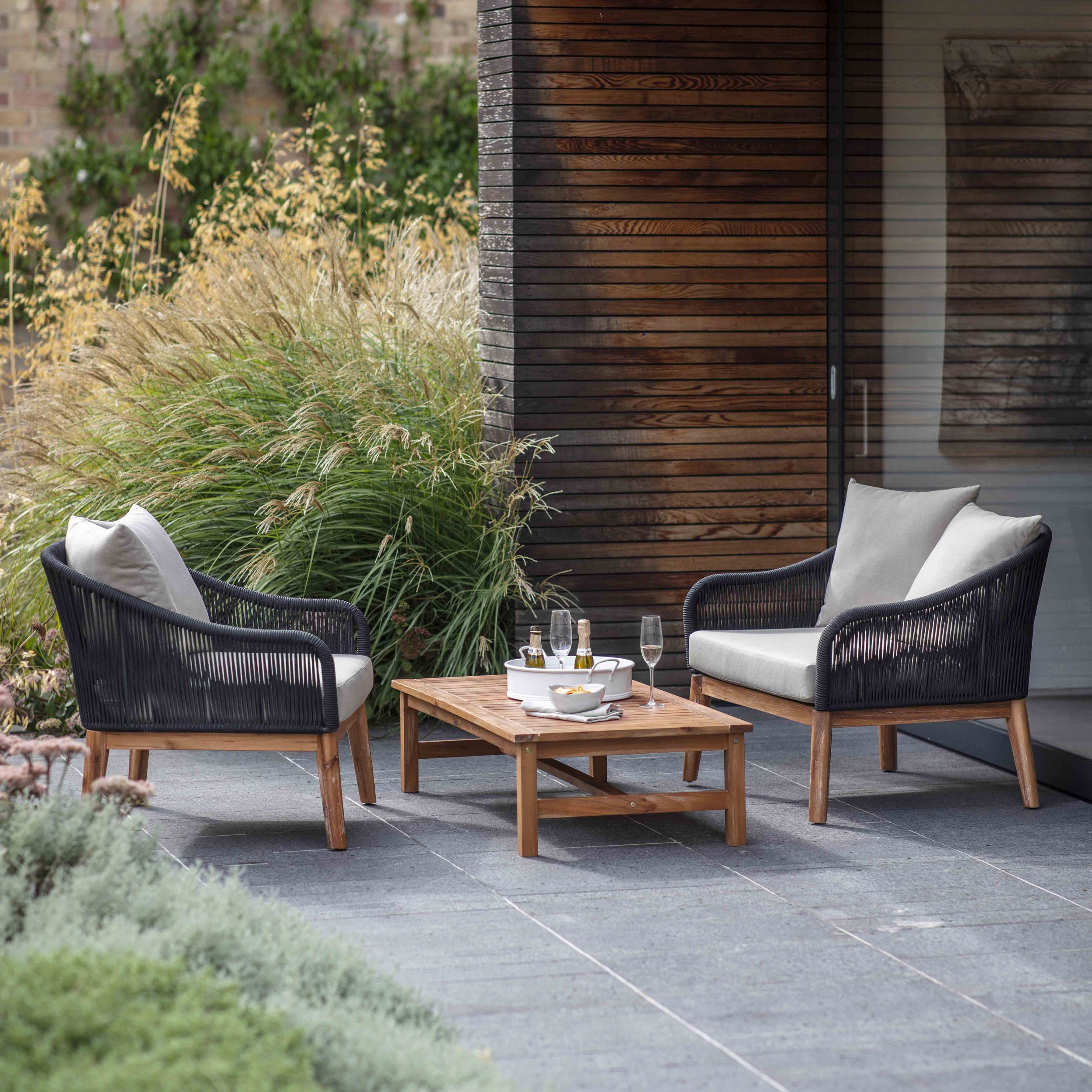 Apartment balconies, patios or that little spot for two. Create a mini lounge outdoors with the Luccombe armchair set. It's a more contemporary version of Colwell, using black polyrope to create stylish seat backs with contrasting wooden legs. With its matching table it’s perfect for soaking up the last of the sunshine with a glass of wine after a long day’s work.