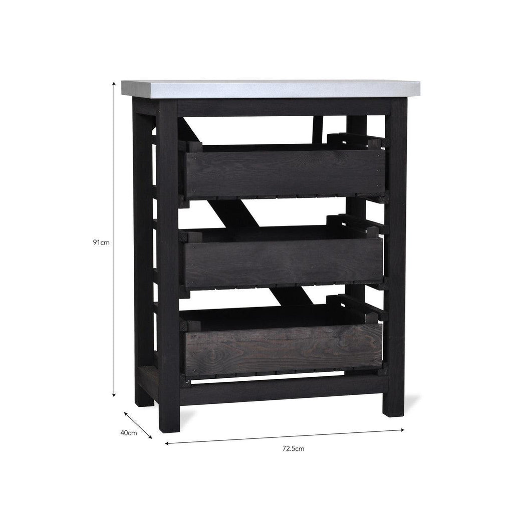 Keeping the garden or potting shed organised just got easier. Crafted from Spruce with a weatherproof black stain, the three-level storage unit is designed to keep a multitude of gardening items stored neatly.