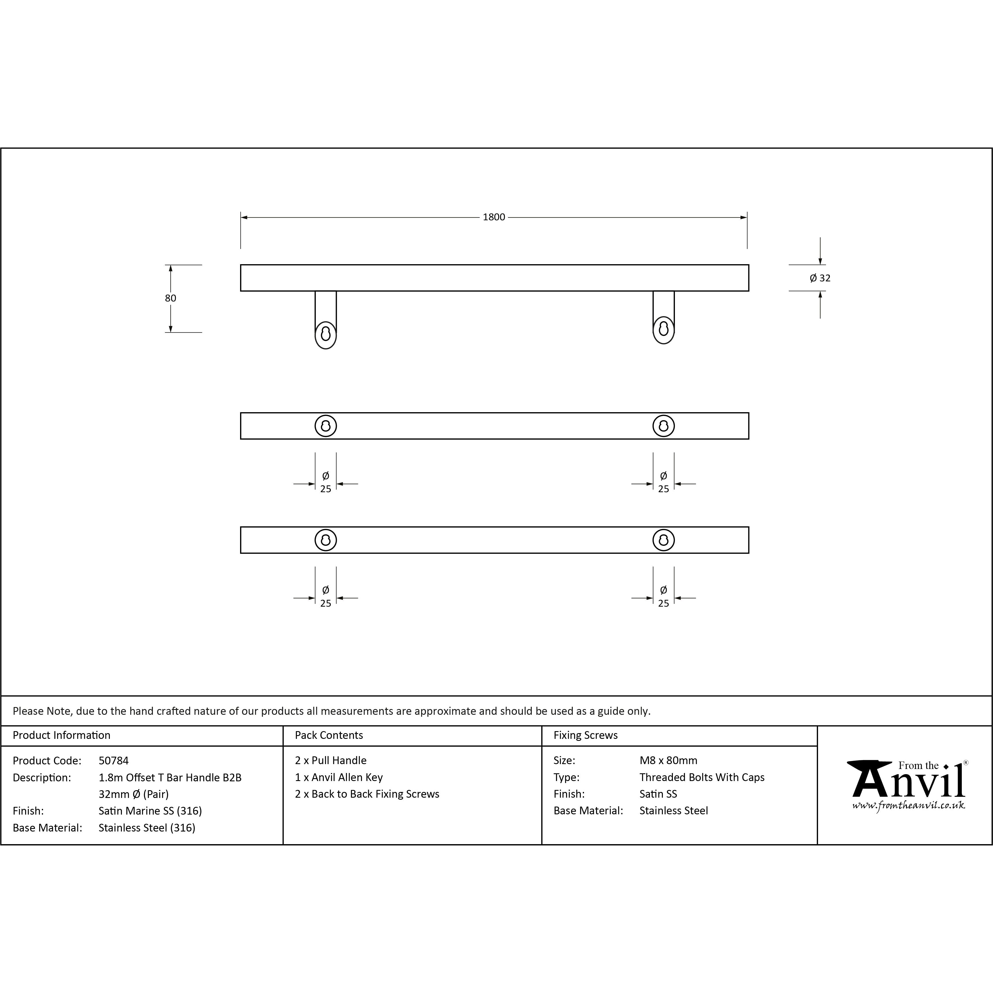 Satin Marine SS (316) 1.8m Offset T Bar Handle B2B 32mm Ø | From The Anvil