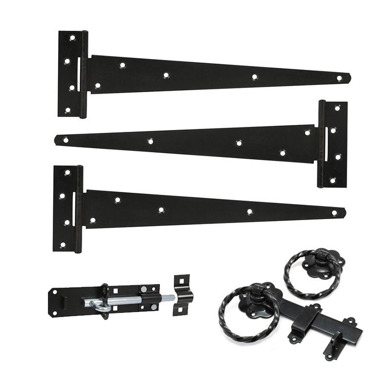 The Ironmongery Pack is the high-quality garden gate fitting kit comes with a standard 3 x T-Hinges with 1 x Brenton Bolt and 1 x Twisted Ring Gate latch, all comes with matching fixing screws with black powder-coated for resistance to rust and corrosion. To be used externally or internally to securely close doors, garden gates and shed doors. Accessible from Both Sides of the Gates.
