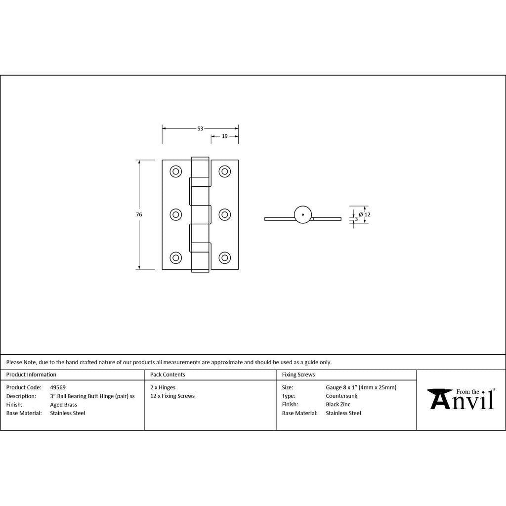 Aged Brass 3" Ball Bearing Butt Hinge (pair) ss | From The Anvil