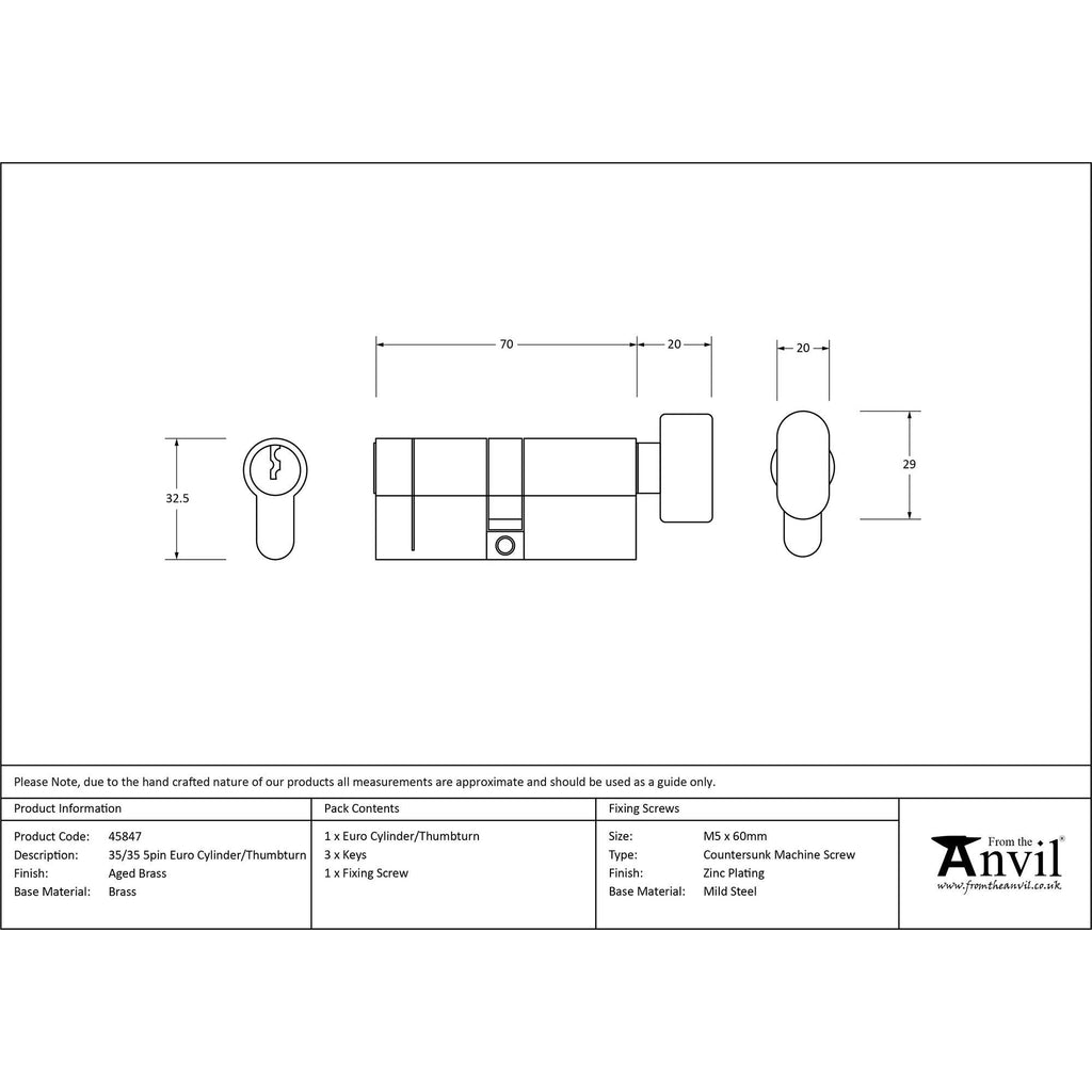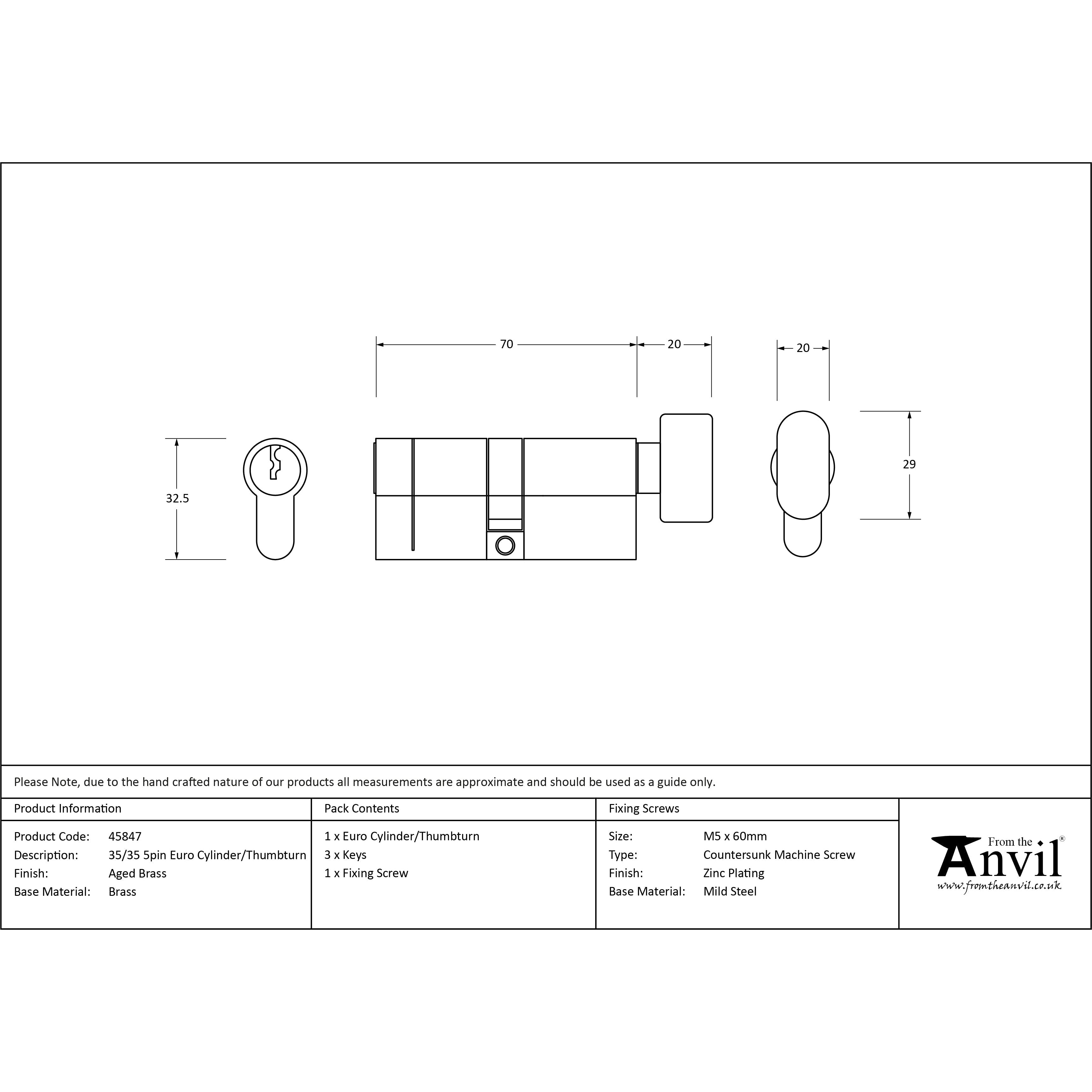 Aged Brass 35/35 5pin Euro Cylinder/Thumbturn | From The Anvil