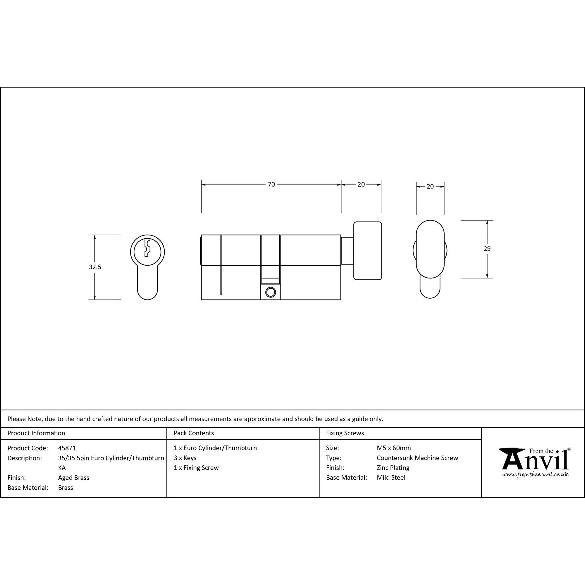 Aged Brass 35/35 5pin Euro Cylinder/Thumbturn KA | From The Anvil
