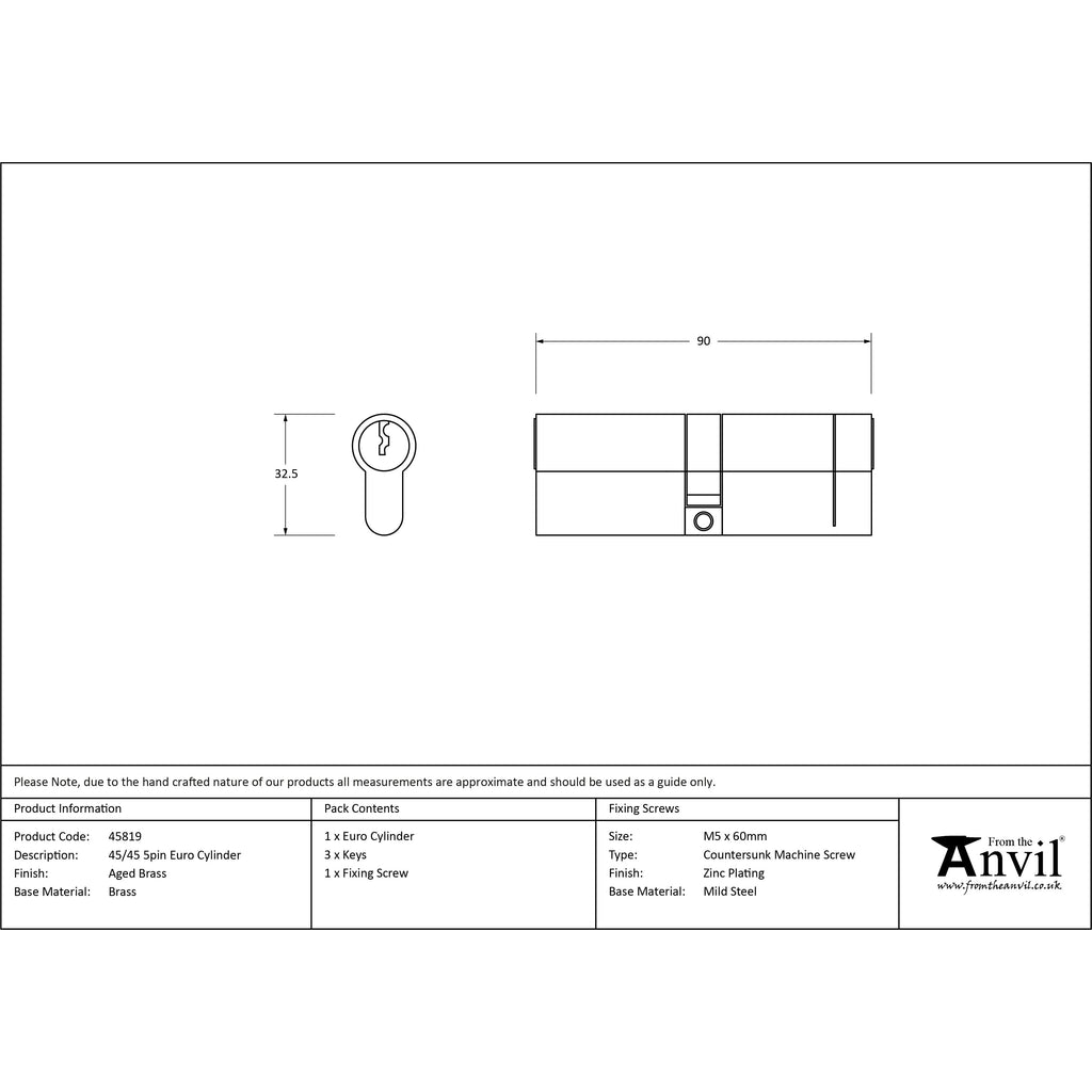 Aged Brass 45/45 5pin Euro Cylinder | From The Anvil