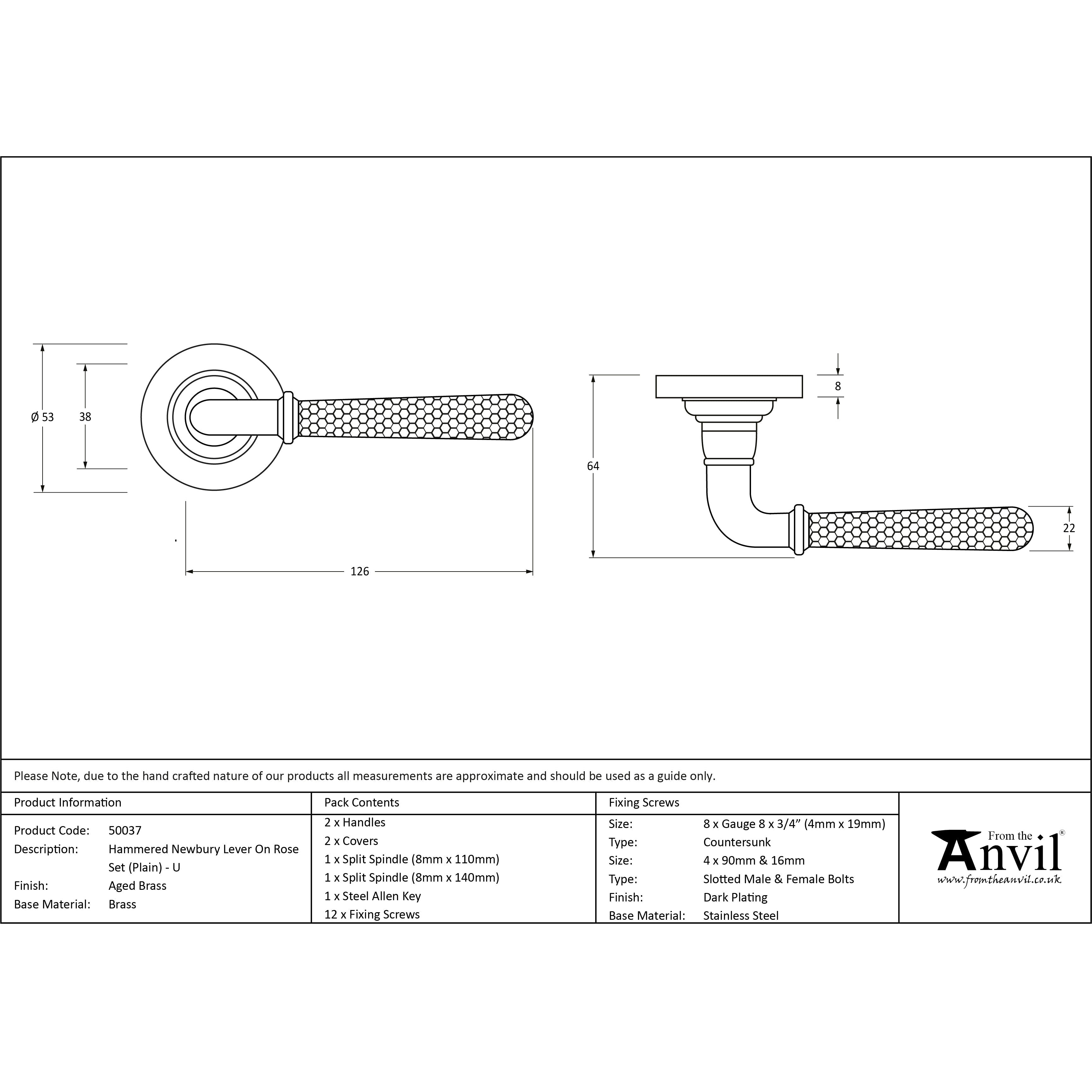 Aged Brass Hammered Newbury Lever on Rose Set (Plain) - Unsprung | From The Anvil