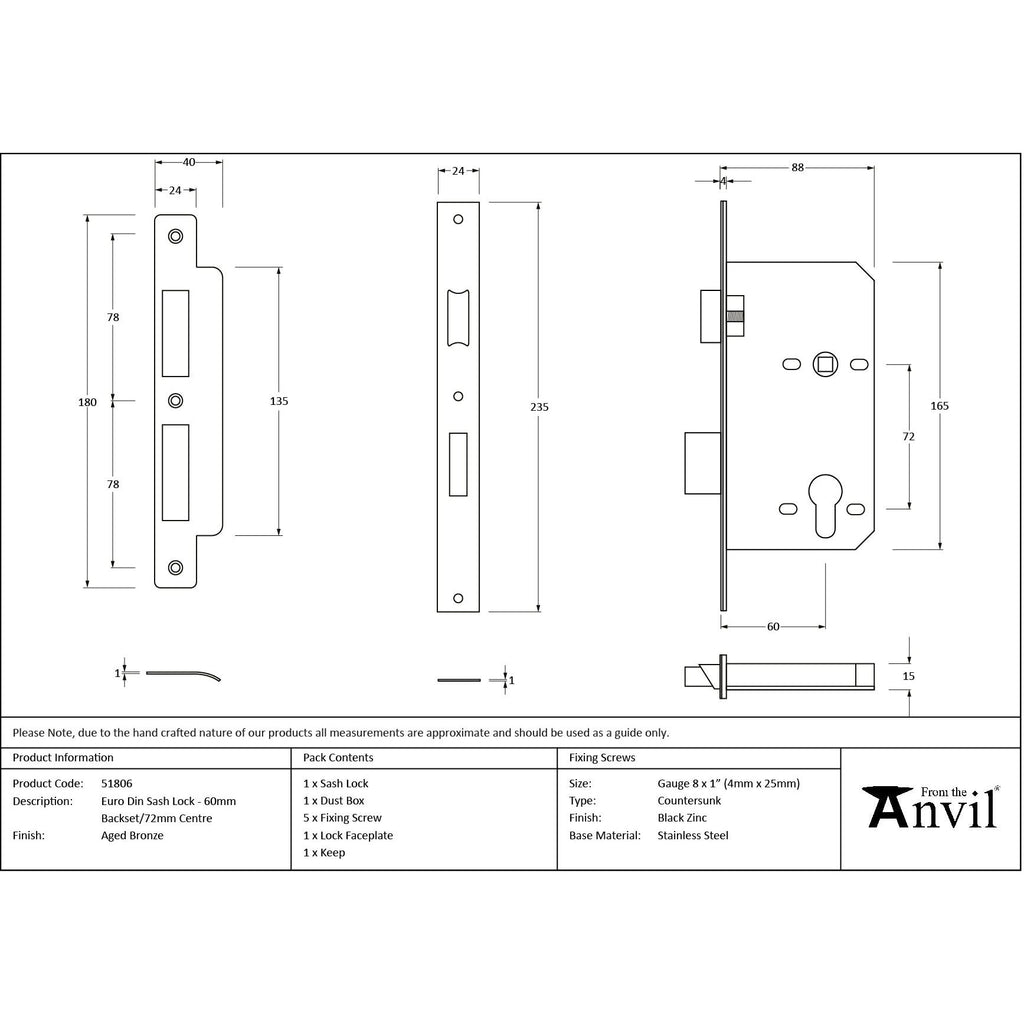 Aged Bronze Euro Din Sash Lock - 60mm Backset/72mm Centre