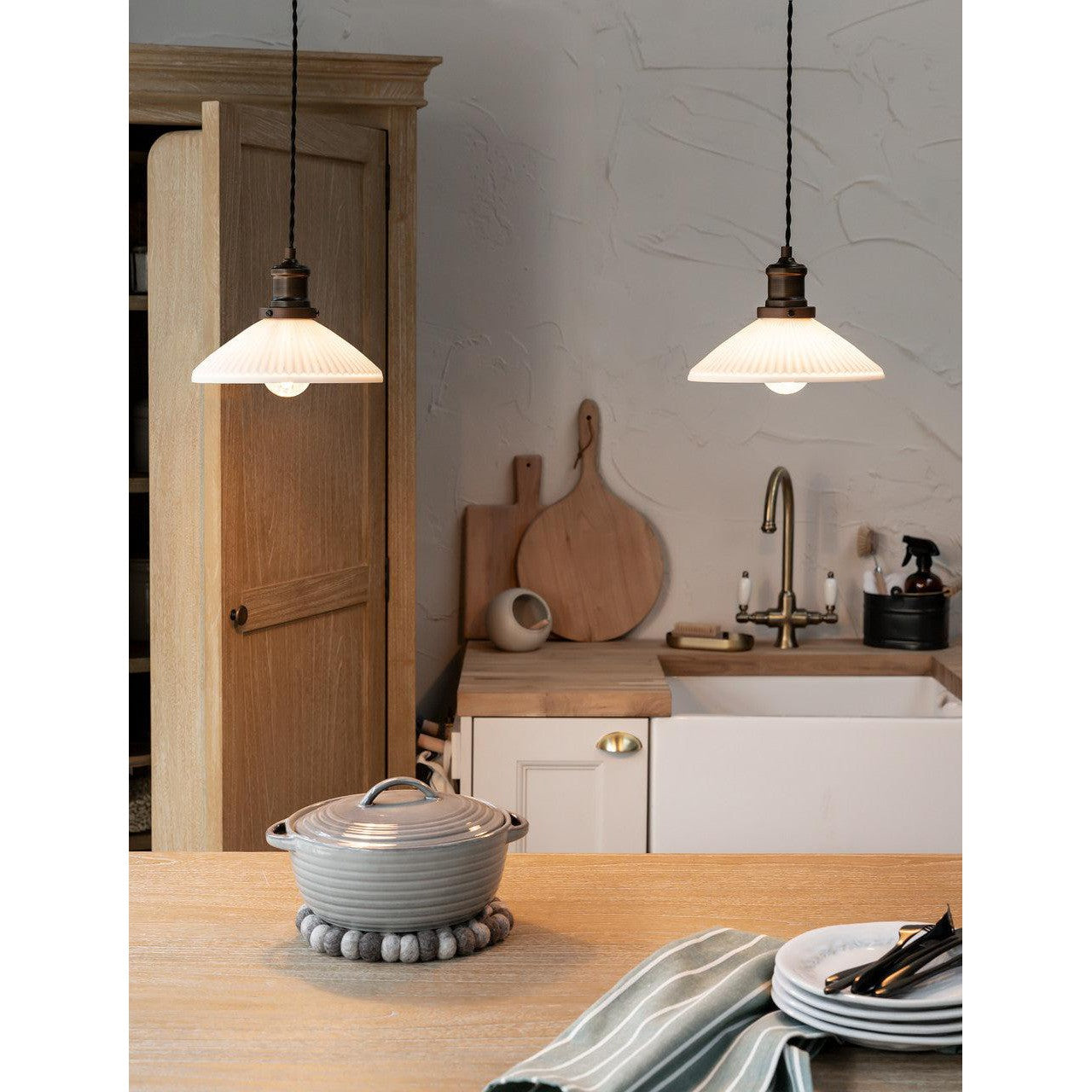 We're seeing double with our Beaulieu Matte Fluted Cone Double Pendant. This striking light features not one, but two stylish fluted ceramic pendants, complete with fashionable black twisted cord and classy Antique Bronze steel lamp holders. The perfect statement light for hanging over a dining table or kitchen island, its cable is adjustable for the perfect drop, while its natural colour is designed to work cohesively, whatever the design and colour scheme of a room. Pair it with our Beaulieu Ceramic Fluted Cone Wall Light in Antique Bronze to complete the makeover.