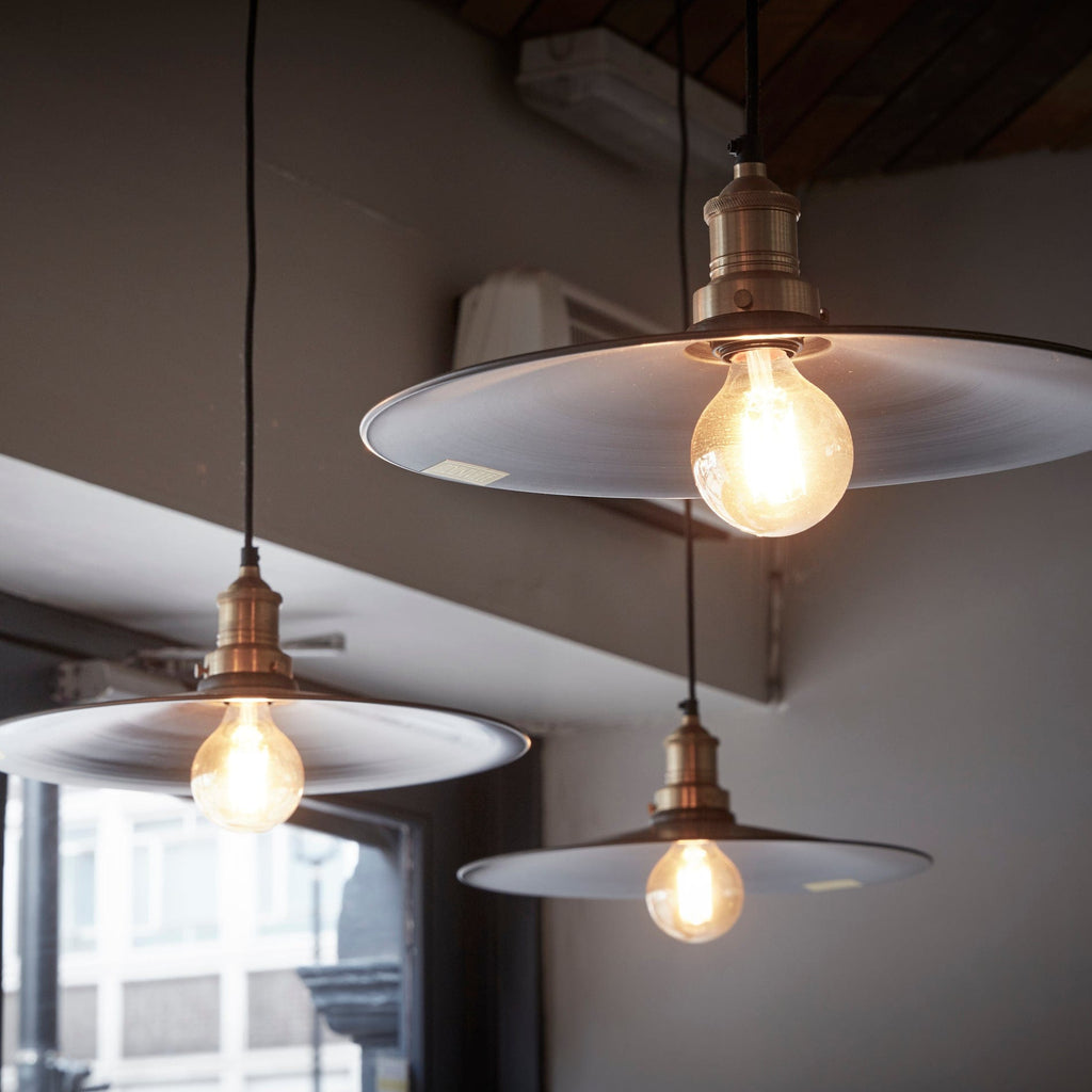 Our Brooklyn Flat 15-inch Pendant Light is also available in Brass and Copper it is perfect to hang in a row perfect for any space. This shade also comes as a Flush Mount in Brass, Pewter or Copper. There's a smaller 8-inch Pendant, Wall Light and Flush Mount variations. Each fixture comes with 1m of Black Round Fabric Flex. Evoking early-20th-century industrial lighting, our reproductions of vintage fixtures retain the classic lines and exposed hardware of the originals. Designed to showcase the warmth of Edison-style Filament Bulbs.