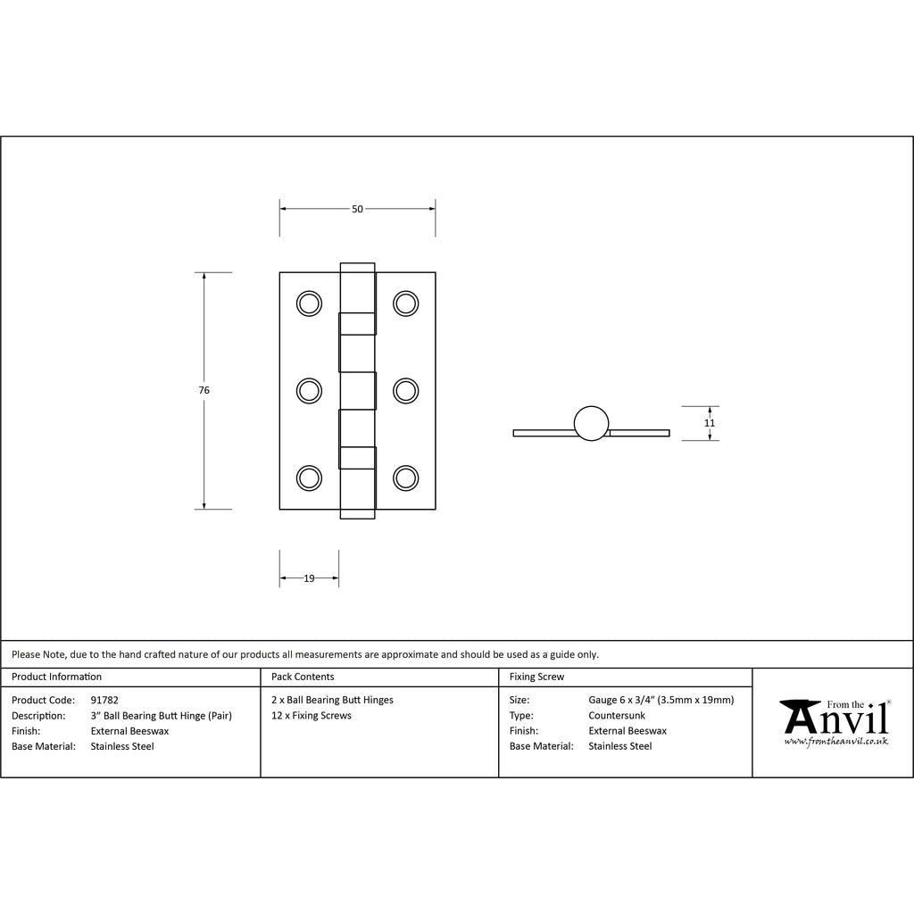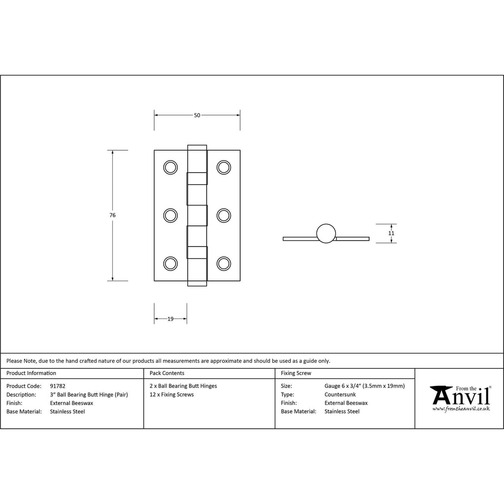 External Beeswax 3" Ball Bearing Butt Hinge (pair) | From The Anvil