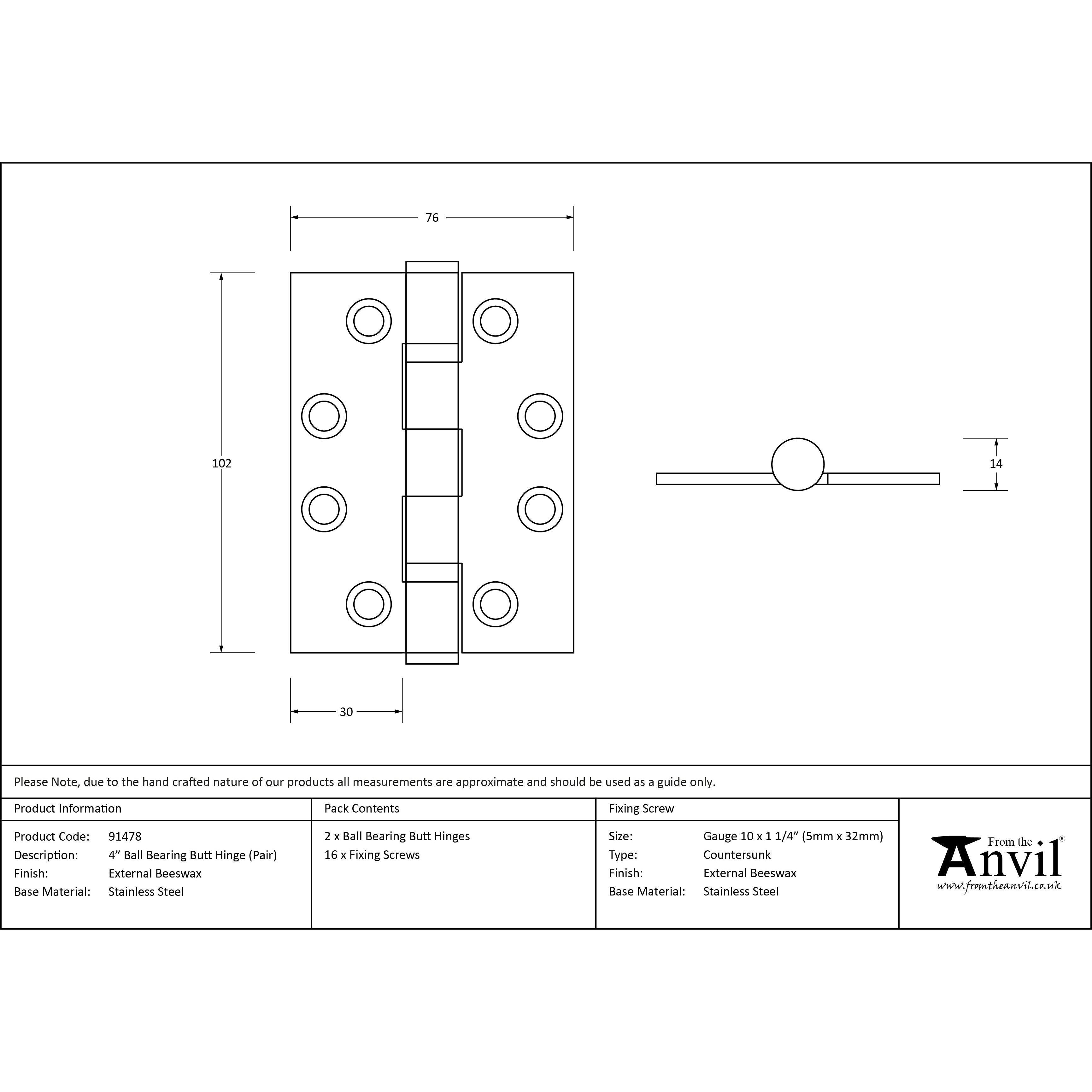 External Beeswax 4" Ball Bearing Butt Hinge (pair) | From The Anvil