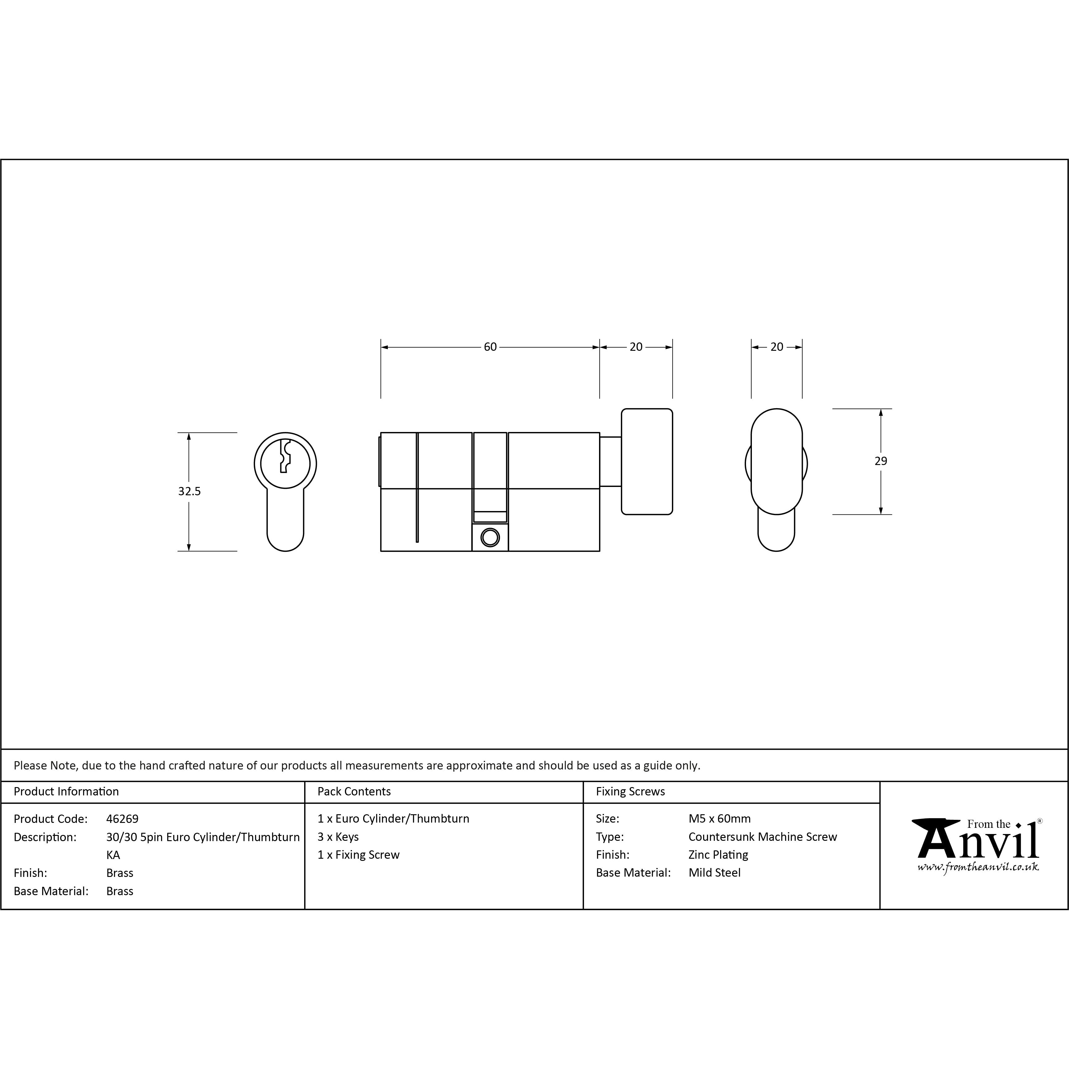Lacquered Brass 30/30 5pin Euro Cylinder/Thumbturn KA | From The Anvil