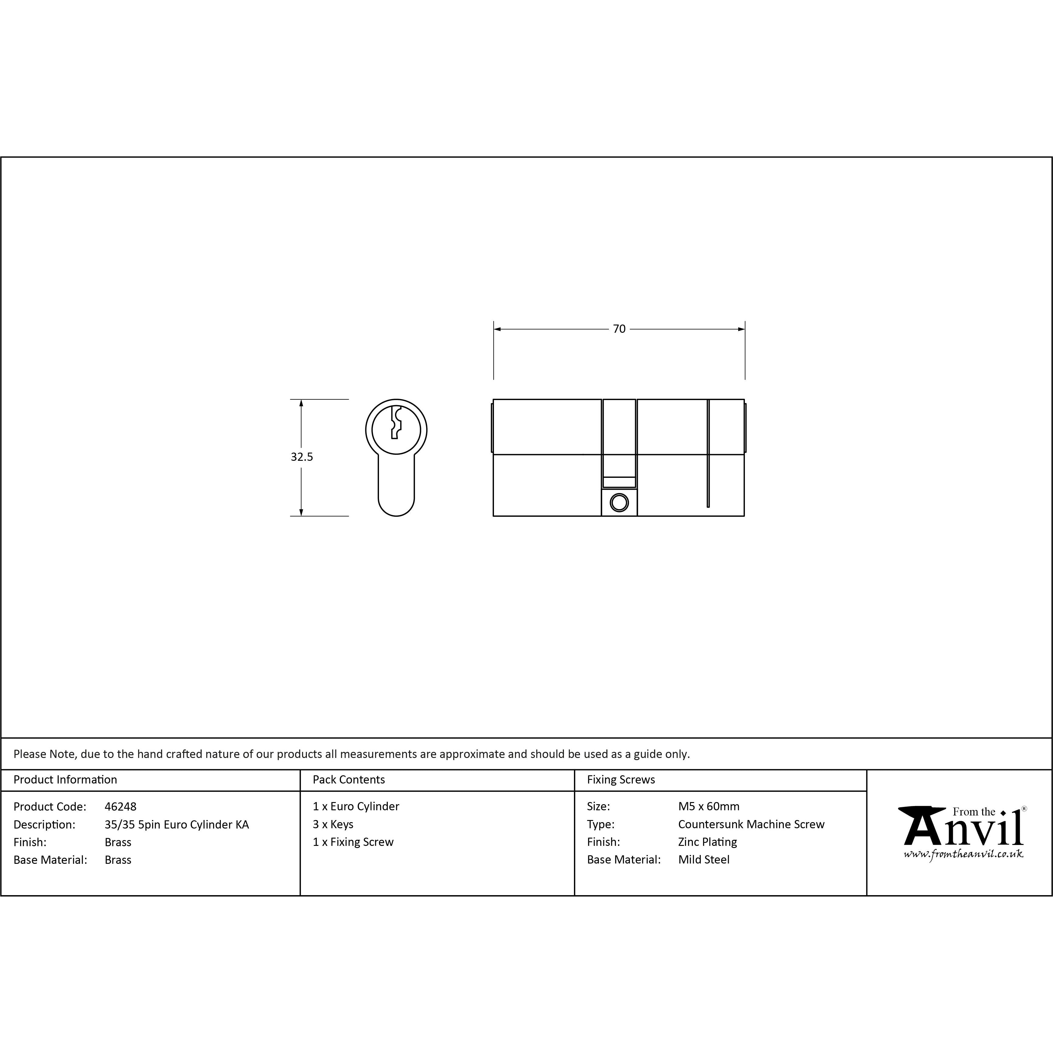 Lacquered Brass 35/35 5pin Euro Cylinder KA | From The Anvil