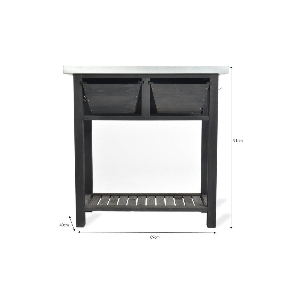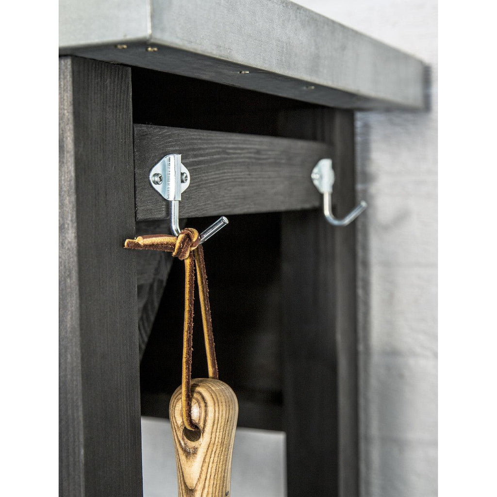 For a pro or novice the Moreton Potting Bench features a range of inbuilt storage to help with gardening. There are two drawers, one specifically designed to house loose soil, a Galvanised Sheet metal top for potting up plants and hooks each side for hanging tools and accessories. The left side includes four moveable S hooks whilst the right has two fixed hooks.