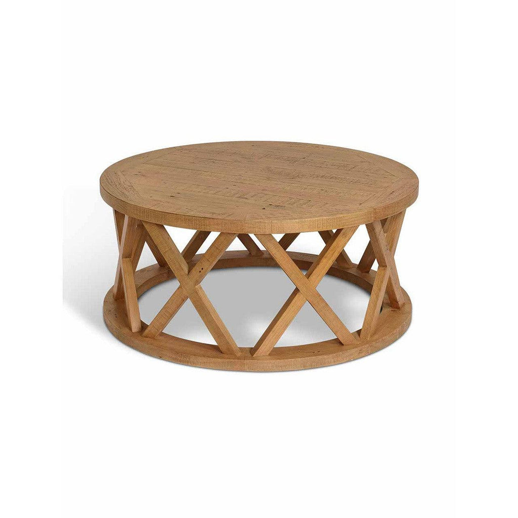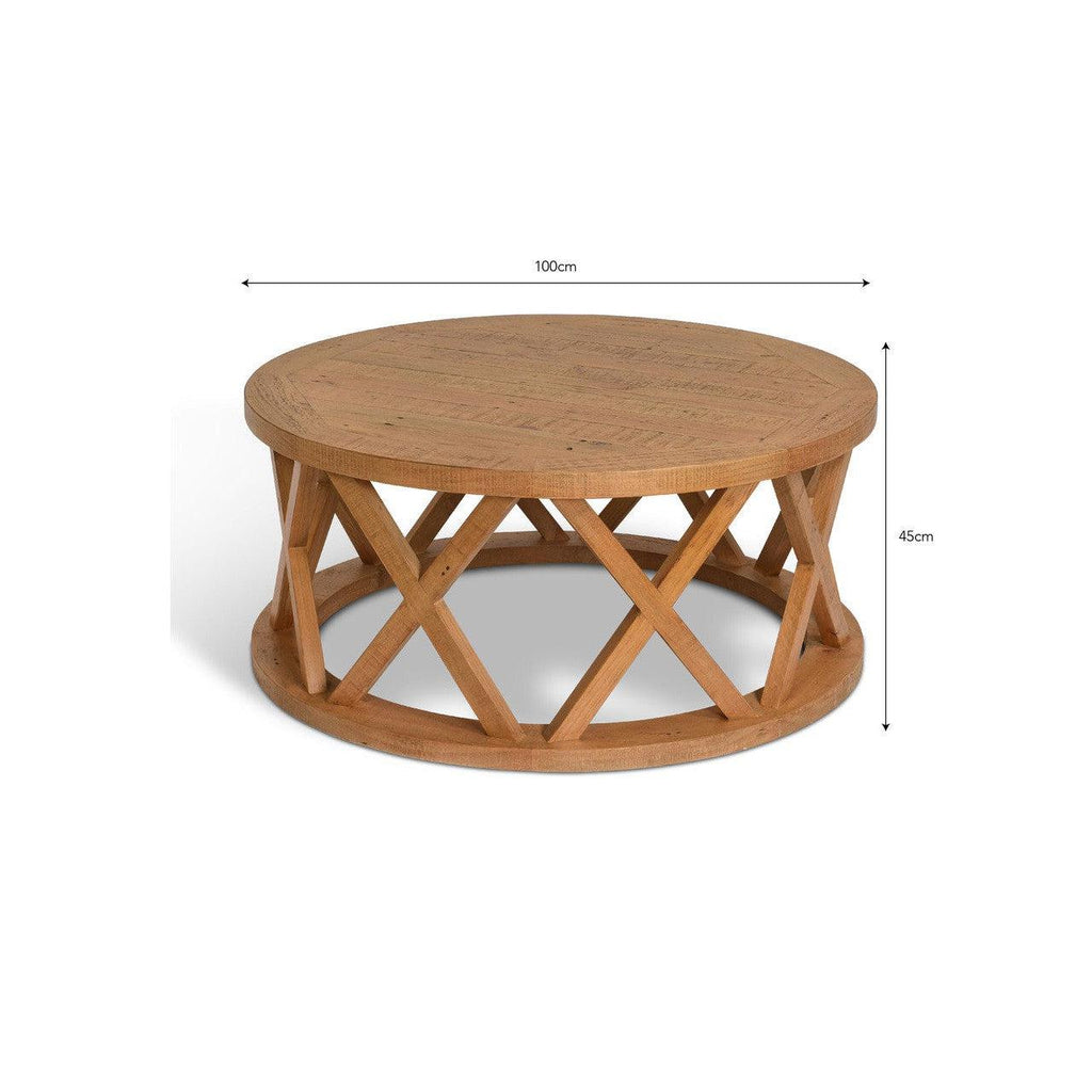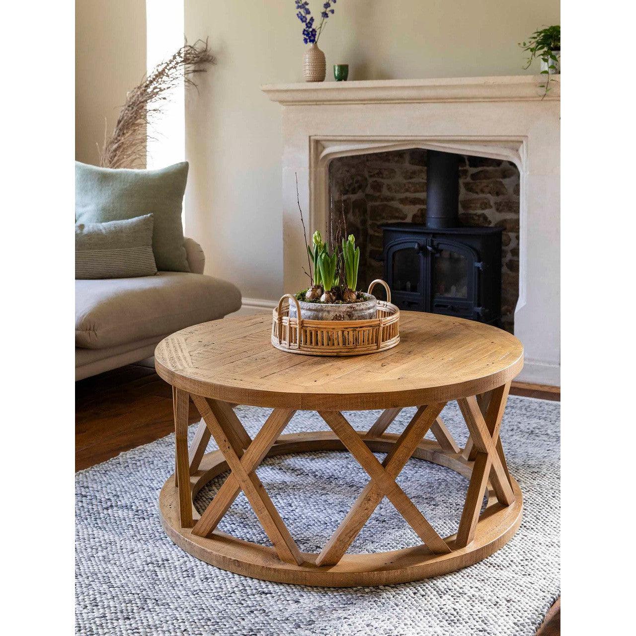 An eye-catching criss-cross design makes our Oxhill Coffee Table the perfect statement piece for a living room. With plenty of room for styling with favourite coffee table books, candles and other decorative finishing touches, this round coffee table is made from reclaimed pine with a light stain and makes a great alternative to a traditional square table. Complete the look with a large rug to put it on and a console table from our Oxhill range to match it with.