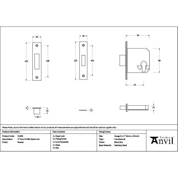 Pewter 3" Euro Profile Dead Lock