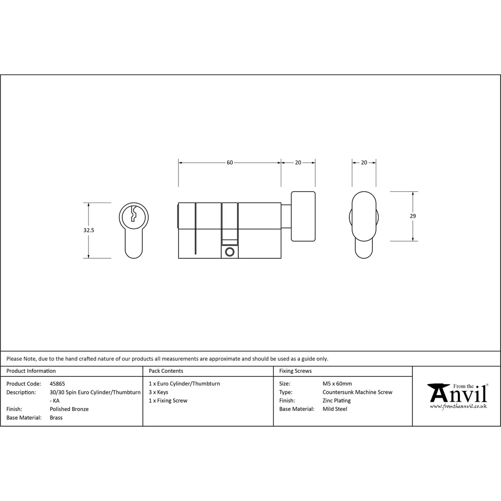 Polished Bronze 30/30 5pin Euro Cylinder/Thumbturn KA | From The Anvil