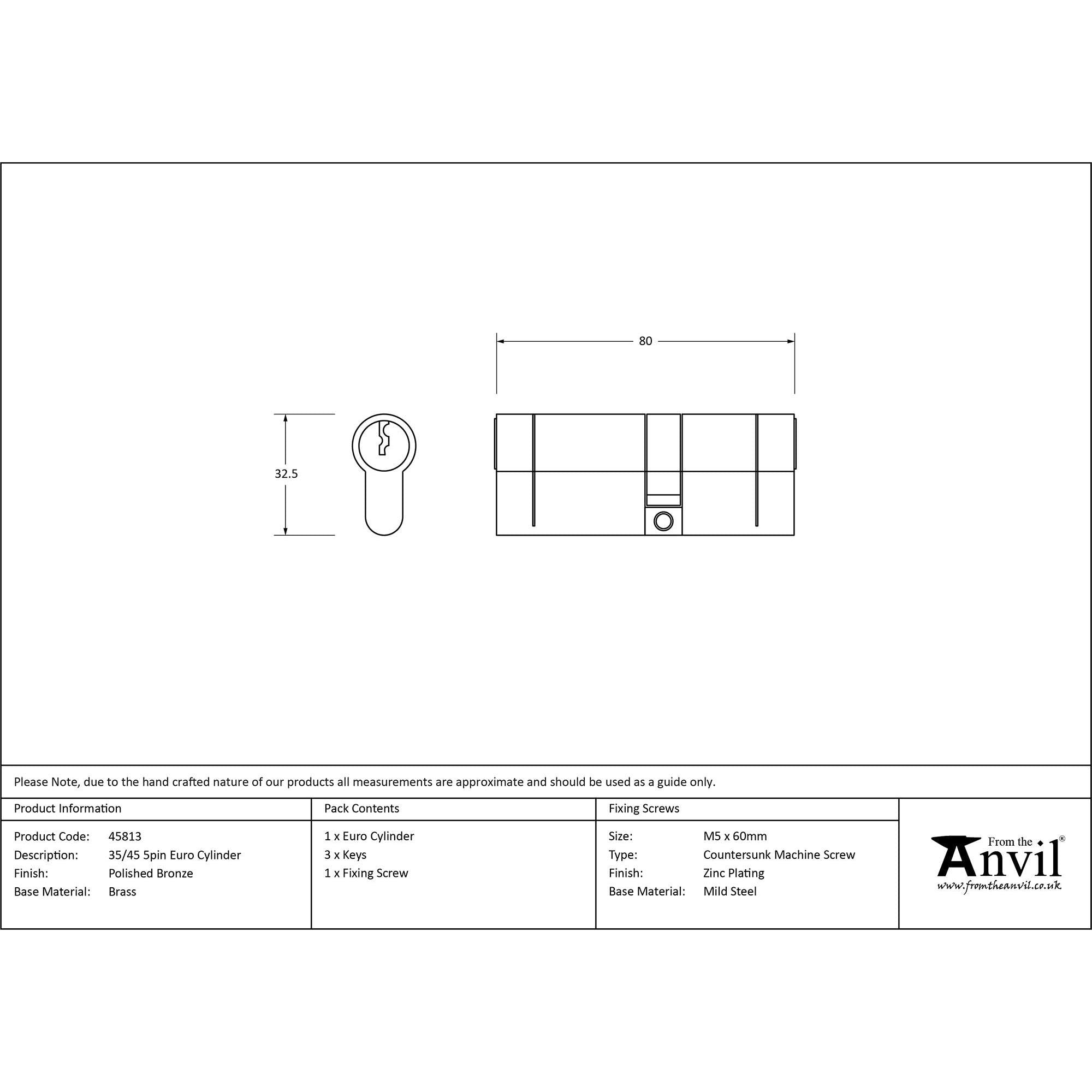 Polished Bronze 35/45 5pin Euro Cylinder | From The Anvil