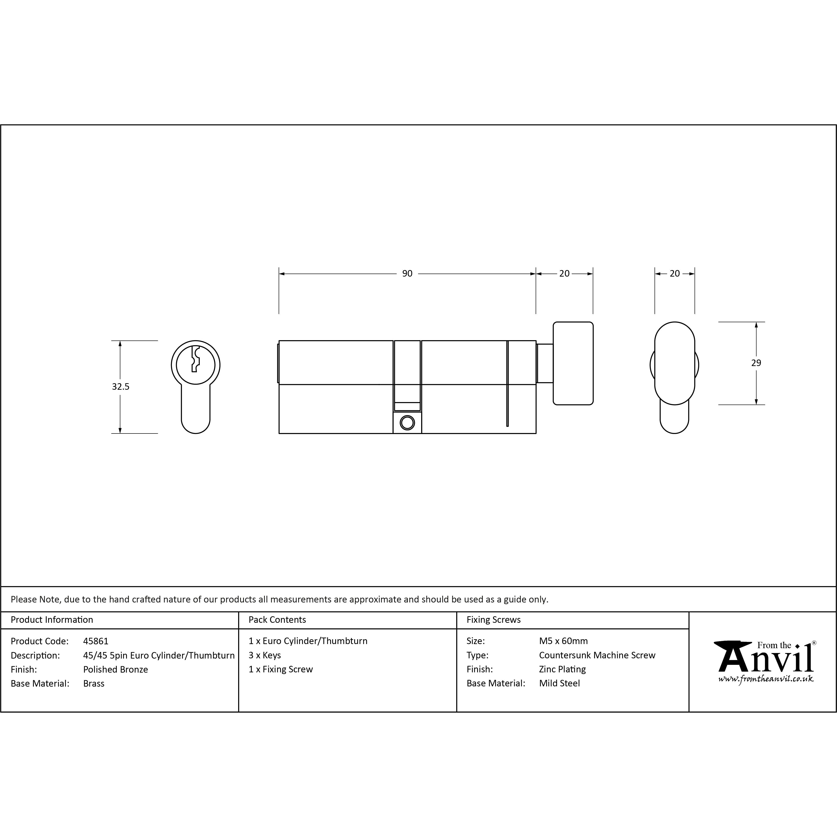 Polished Bronze 45/45 5pin Euro Cylinder/Thumbturn | From The Anvil
