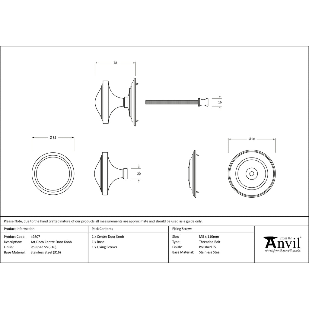Polished Marine SS (316) Art Deco Centre Door Knob | From The Anvil