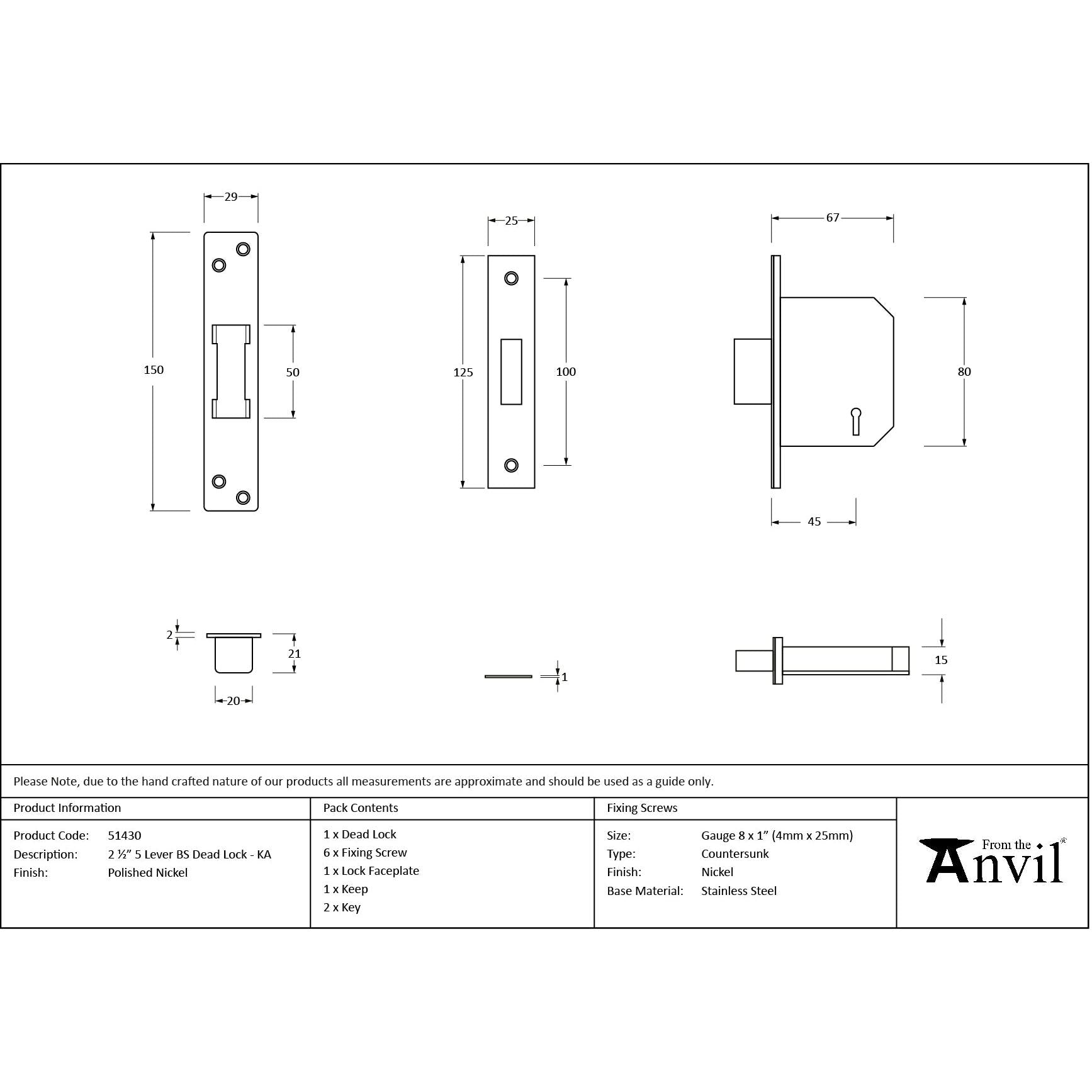Polished Nickel 2½" 5 Lever BS Dead Lock KA