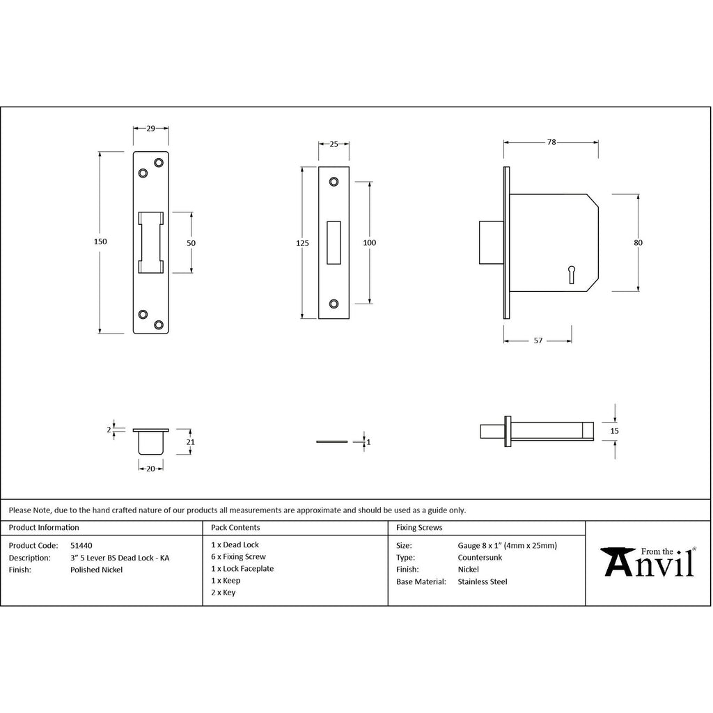 Polished Nickel 3" 5 Lever BS Dead Lock KA