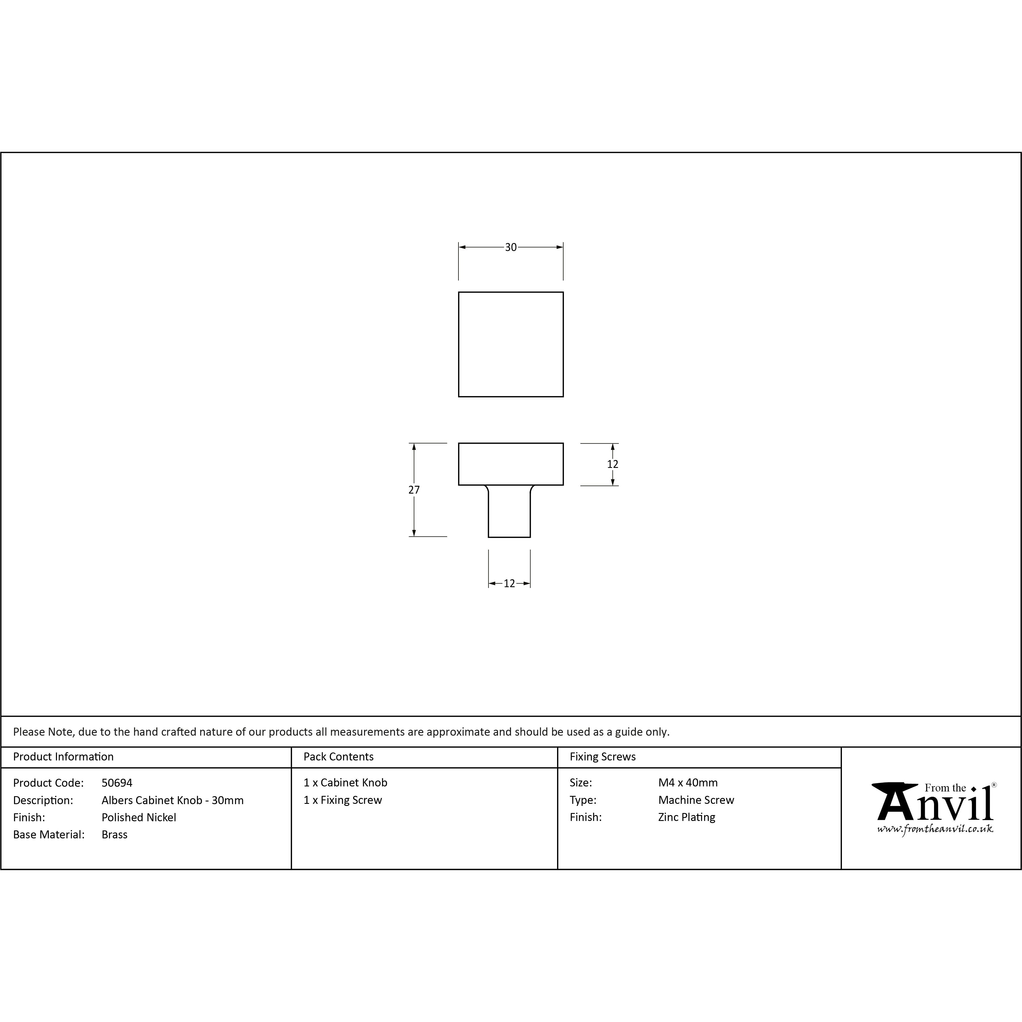Polished Nickel Albers Cabinet Knob - 30mm | From The Anvil