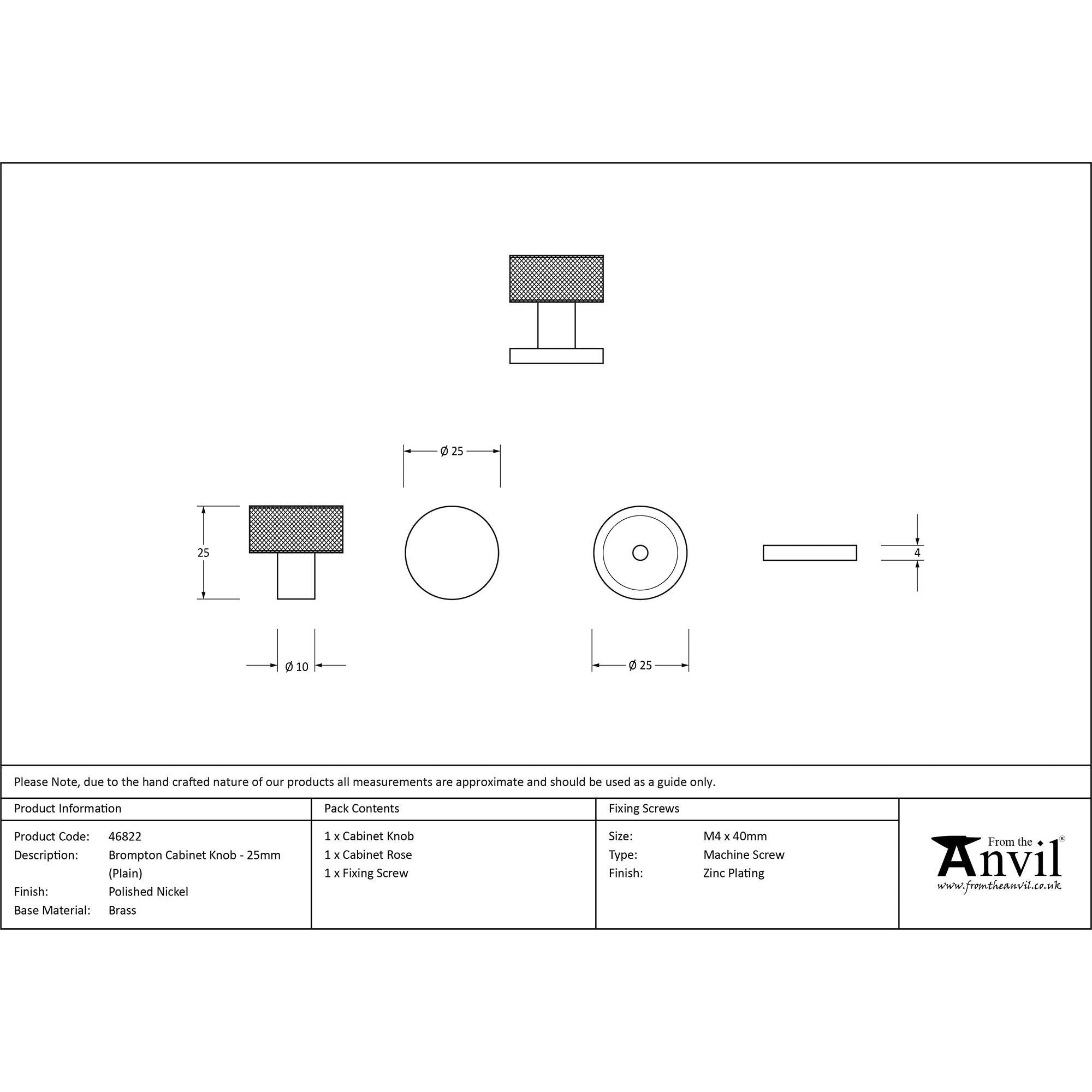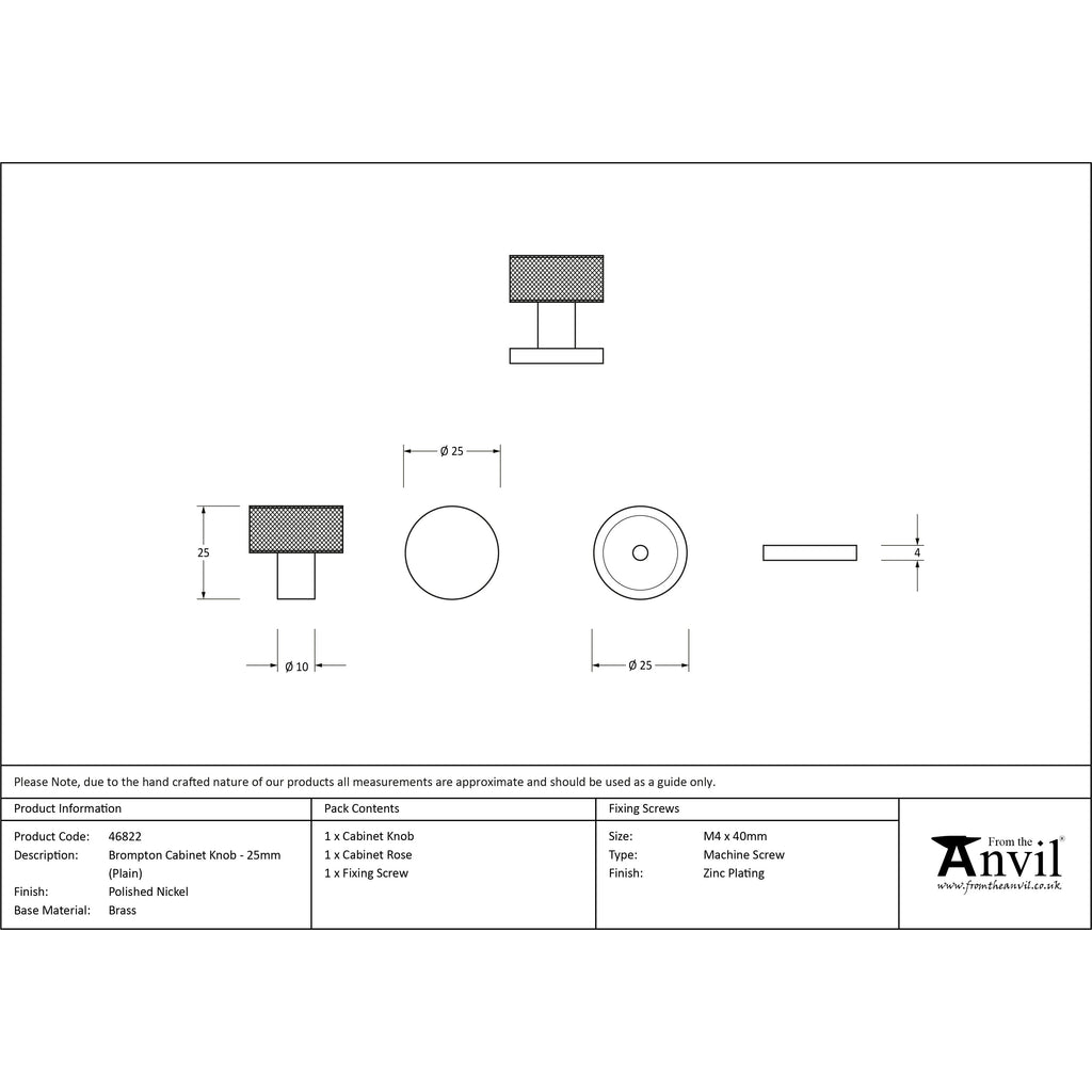 Polished Nickel Brompton Cabinet Knob - 25mm (Plain) | From The Anvil
