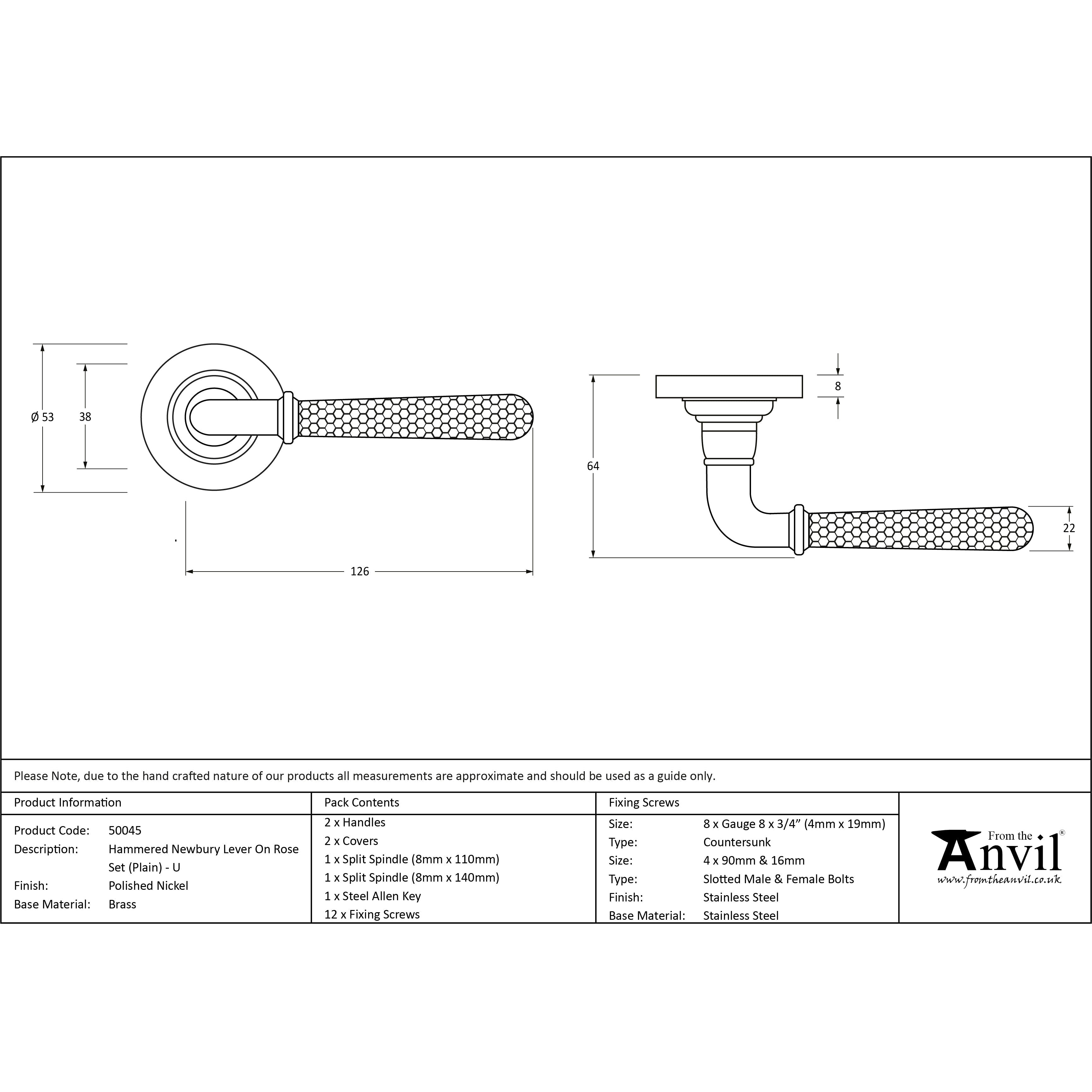 Polished Nickel Hammered Newbury Lever on Rose Set (Plain) - Unsprung | From The Anvil