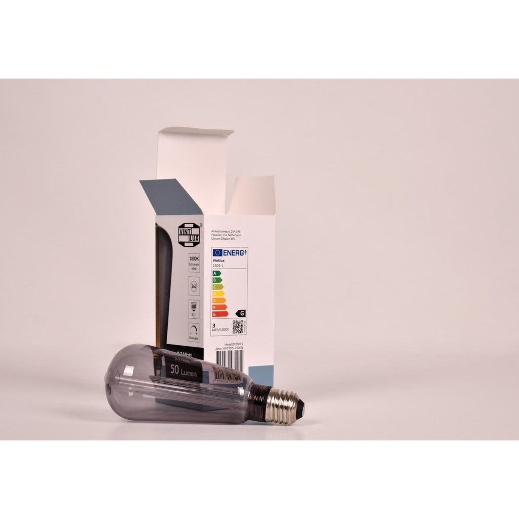 The stylish Vintlux® Filament LED Lamp "Rainn Edison Smoke" is an elegant and durable light source. The lamps have a modern smoked glass in the timeless Edison shape and provide an atmospheric warm white light. In combination with the unique straight filament that resembles falling rain, these lamps give a pleasant light distribution in any space.