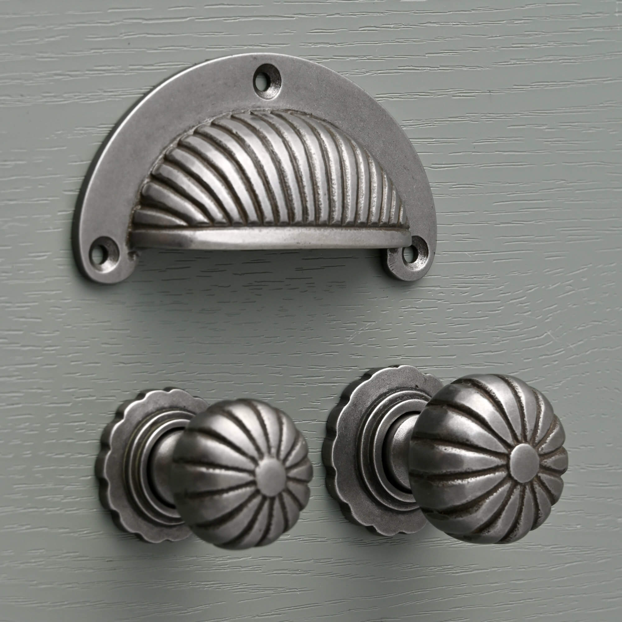 Make a statement with our beautiful reeded cup pull and cabinet knobs in solid cast iron with a lightly polished finish to highlight the stunning detail on these handles. These handles have been cast by hand so each one is unique and has its own character. Perfect for a range of applications such as in a kitchen/bathroom/bedroom or for furniture restoration projects.