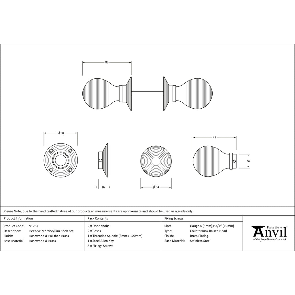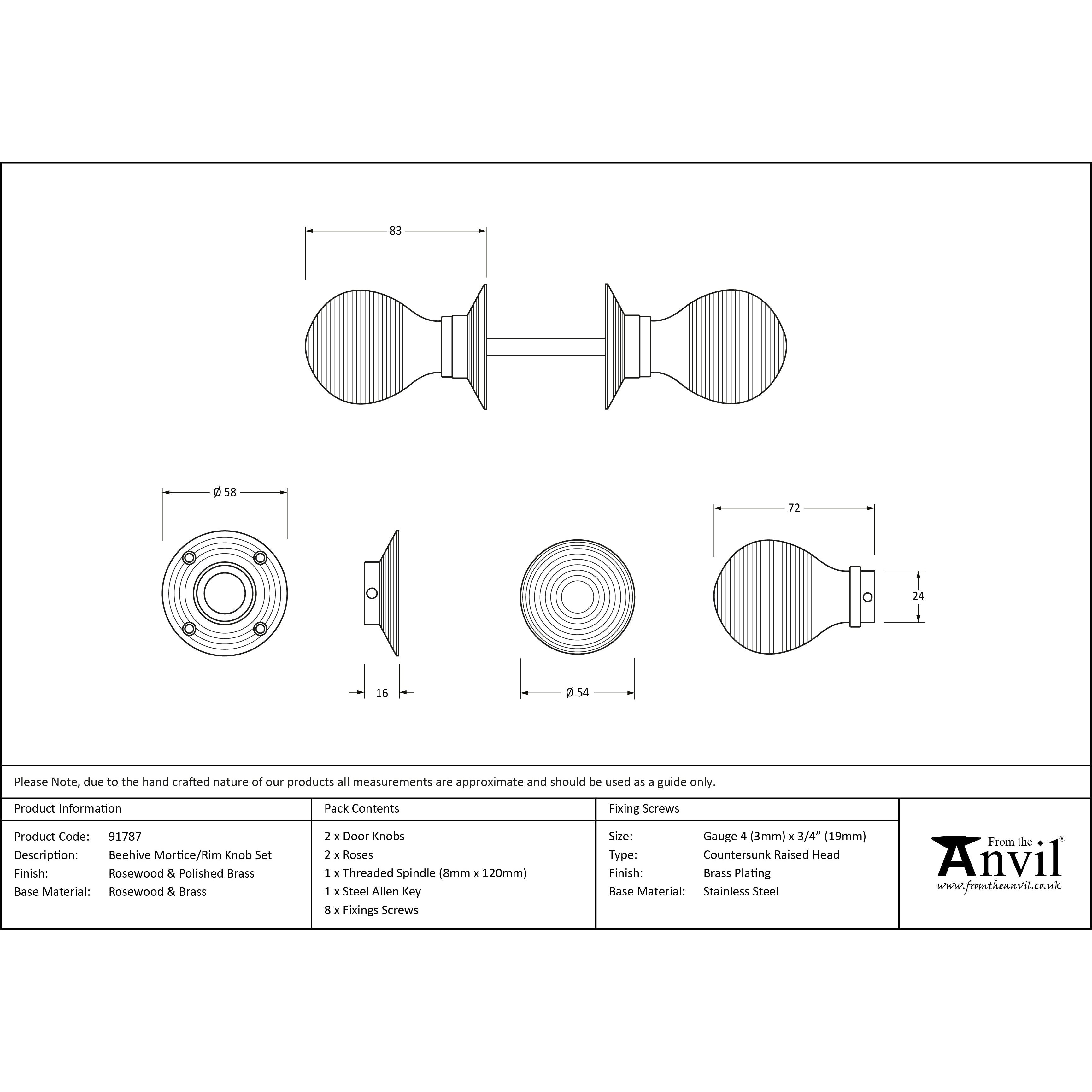 Rosewood & Polished Brass Beehive Mortice/Rim Knob Set | From The Anvil