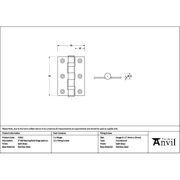 Satin Brass 3" Ball Bearing Butt Hinge (Pair) ss