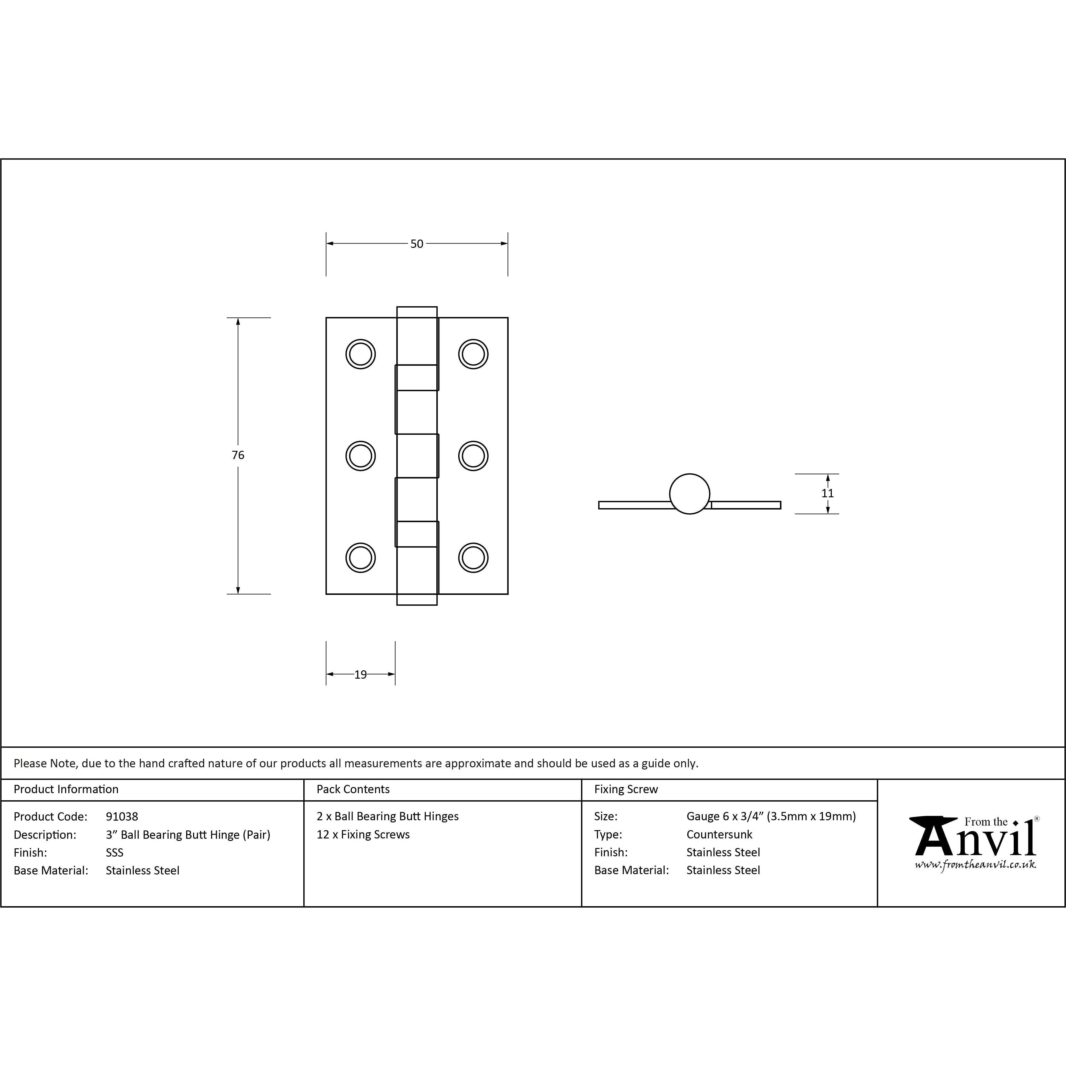 Satin SS 3" Ball Bearing Butt Hinge (pair) | From The Anvil