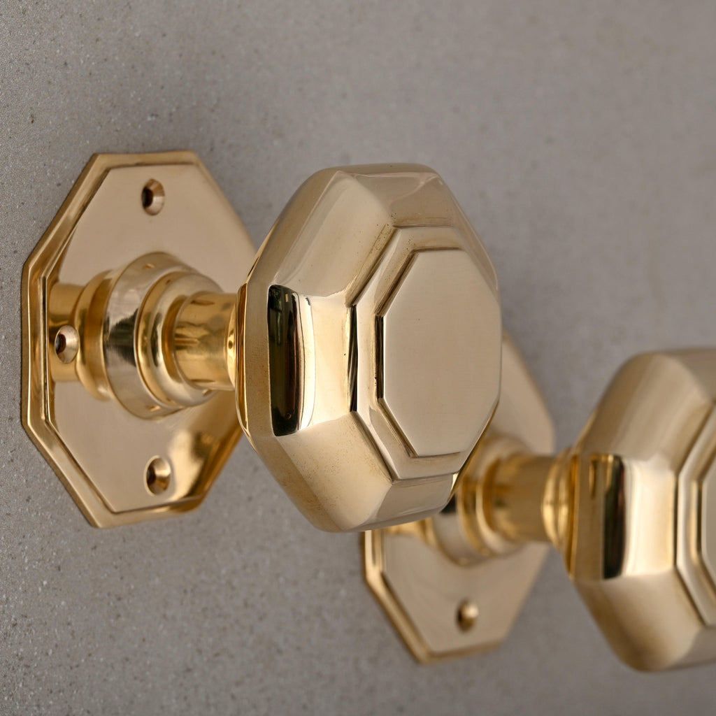 A beautiful pair of solid brass octagonal Georgian door knobs cast by hand using traditional casting methods. At 70mm wide they will make a statement on any door and are most suited to traditional properties with large doors.